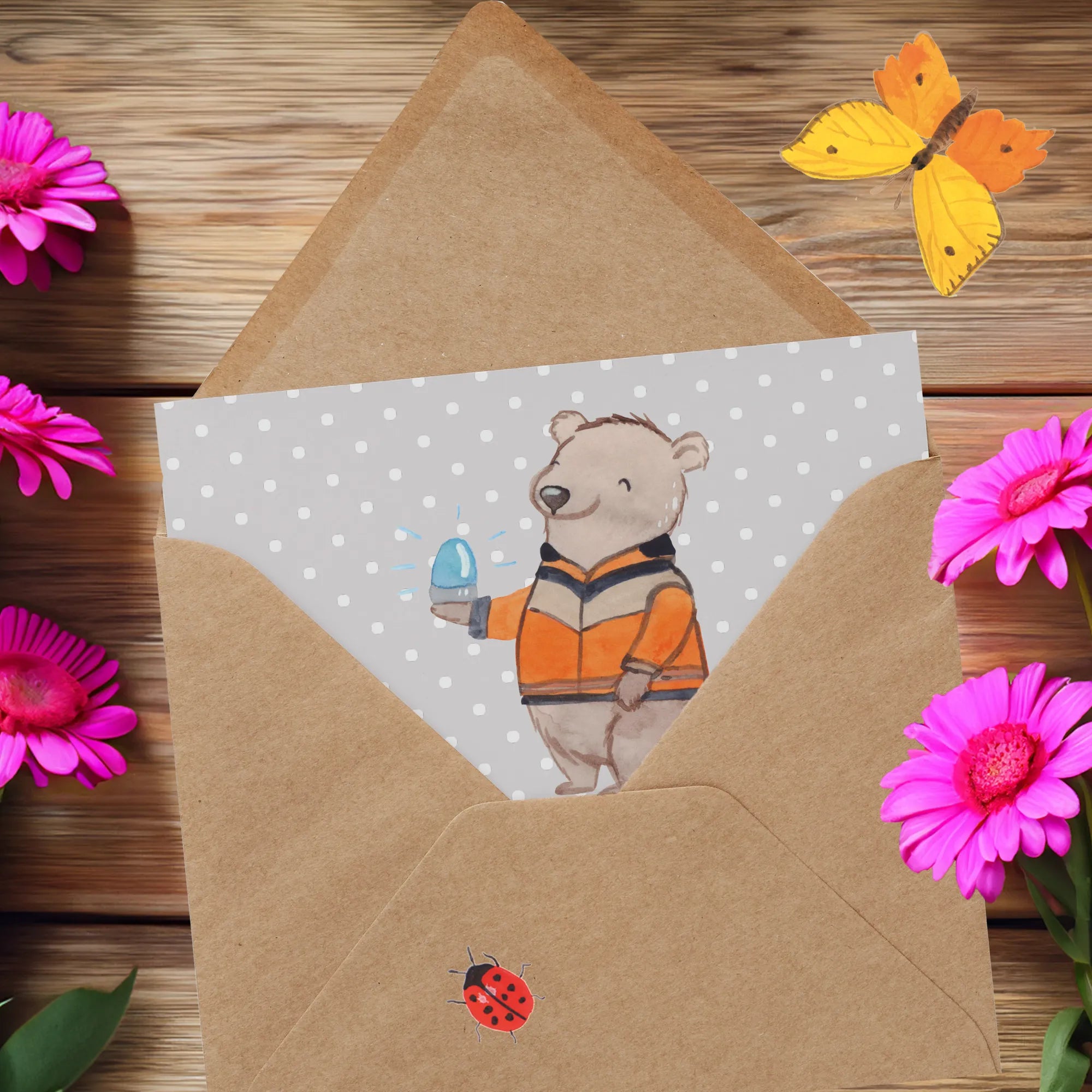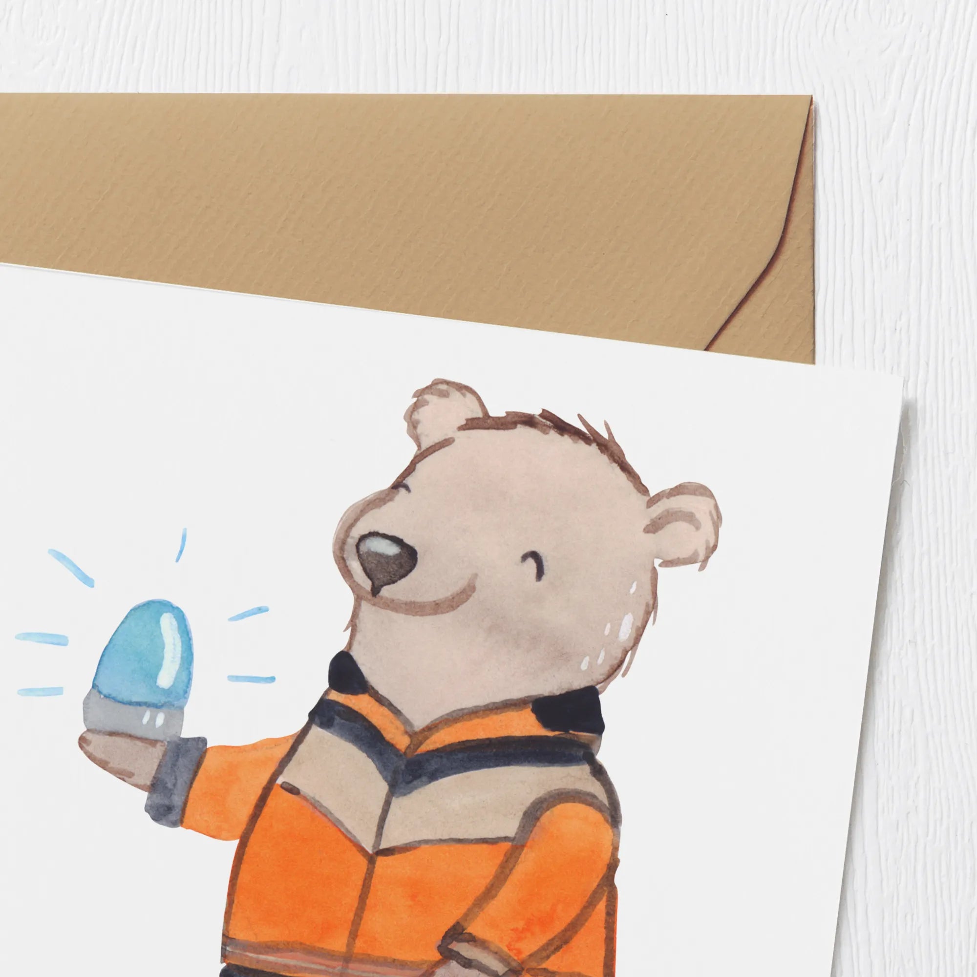 Der Retter mit Herz zeigt sich hier in Form eines niedlichen Bären, ganz im Stil eines Rettungswagenfahrers: Uniform, Einsatzjacke und ein kleines Blaulicht in seiner Pfote. Dieses Motiv ist eine liebevolle Verneigung vor allen, die anderen in Not zur Seite stehen. Es kombiniert professionelle Elemente mit einer warmen, einladenden Ausstrahlung, sodass das Motiv sowohl Respekt als auch Zuneigung vermittelt.