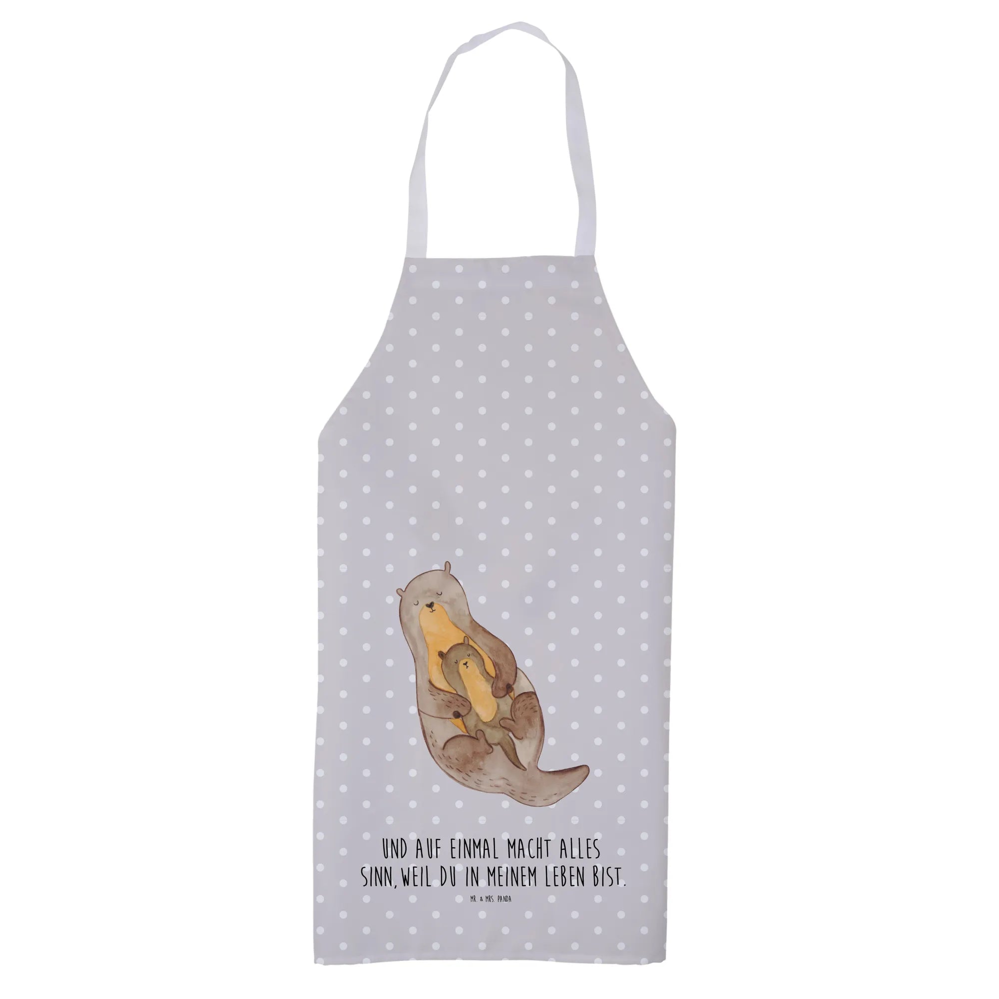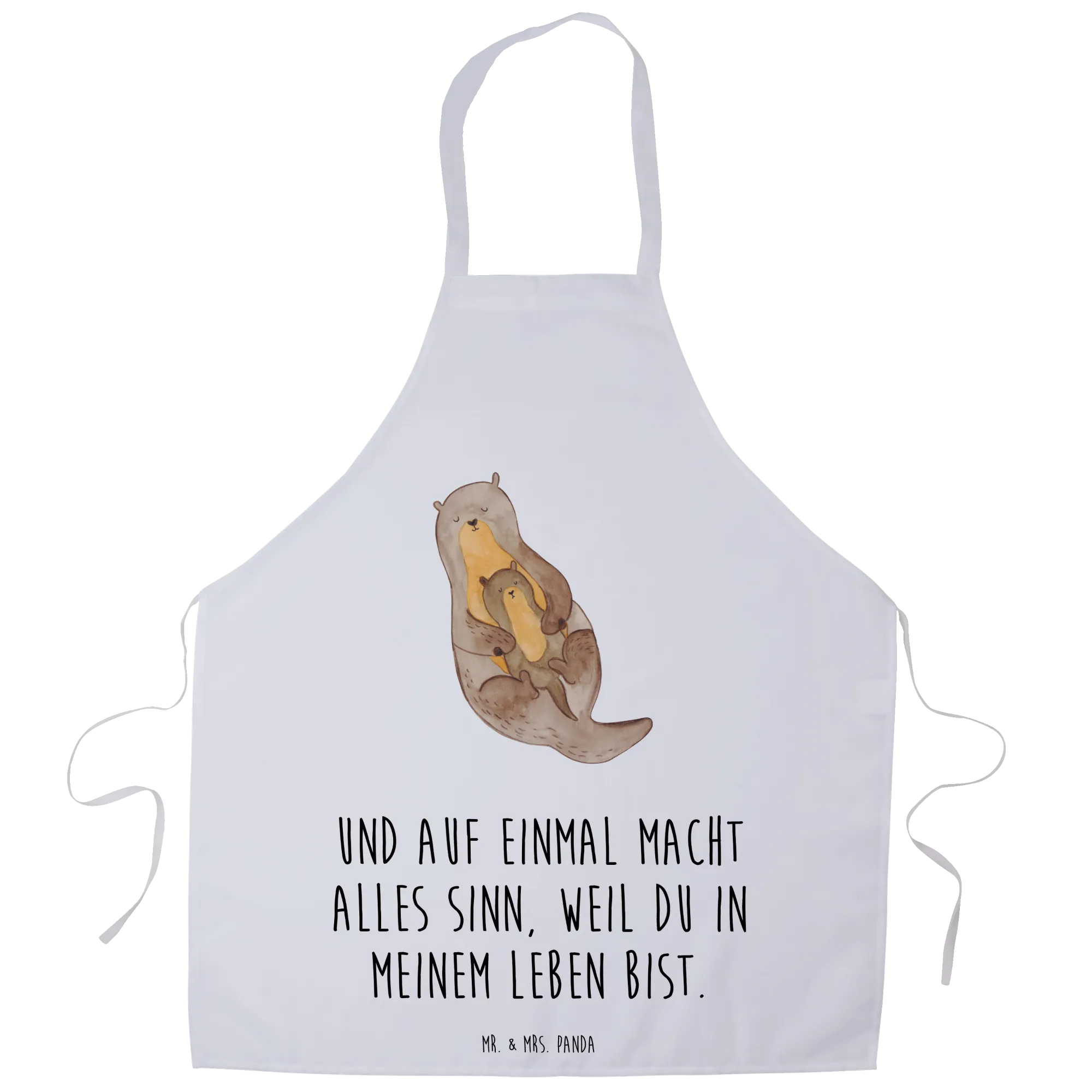 Liebevolle Illustration: Mrs. Panda hat das Otter-Motiv mit viel Herz gezeichnet. Die detailreiche Darstellung auf hellem Hintergrund wirkt edel und bringt das Motiv besonders schön zur Geltung. Der begleitende Spruch „Und auf einmal macht alles Sinn, weil du in meinem Leben bist.“ macht die Schürze zu einem emotionalen Geschenk.