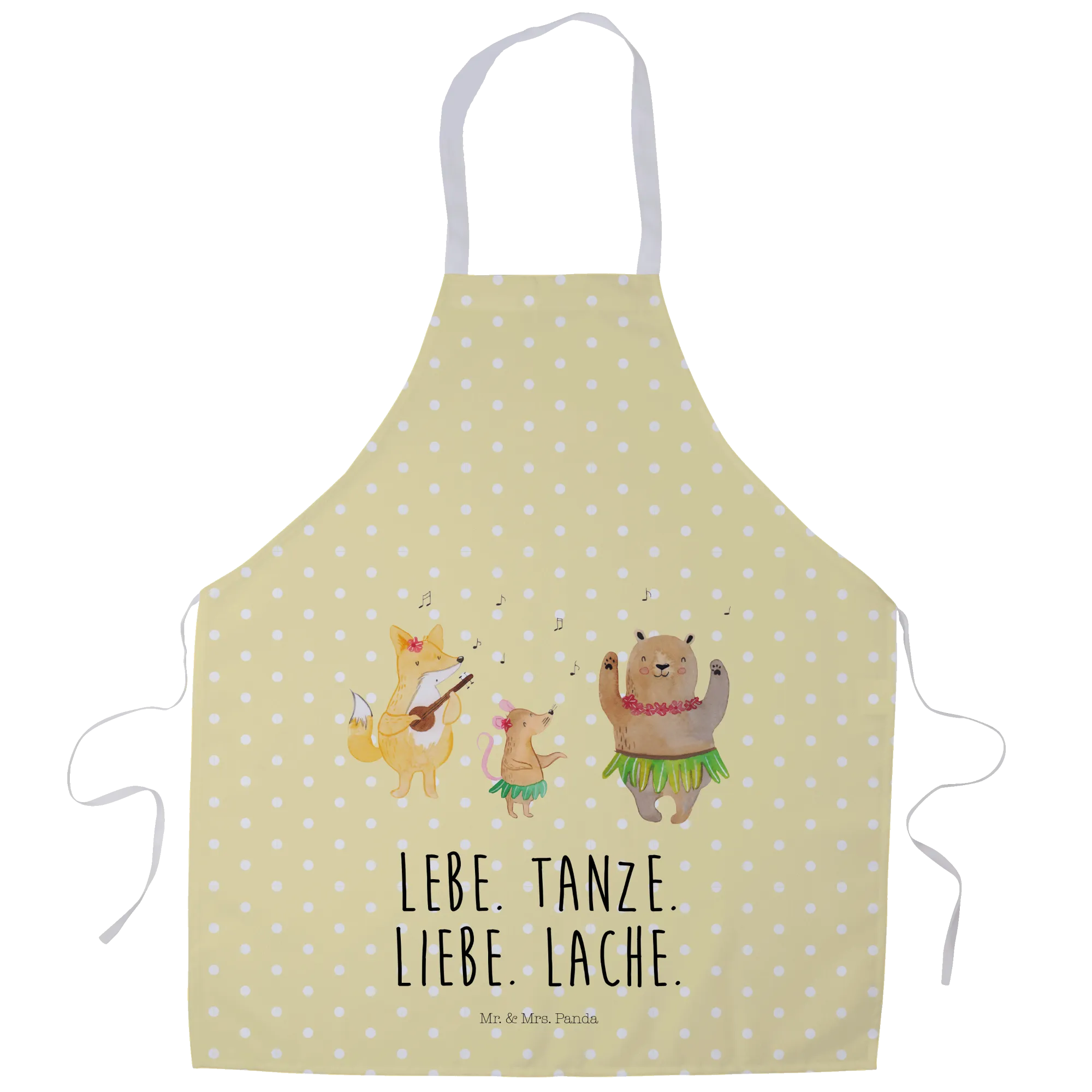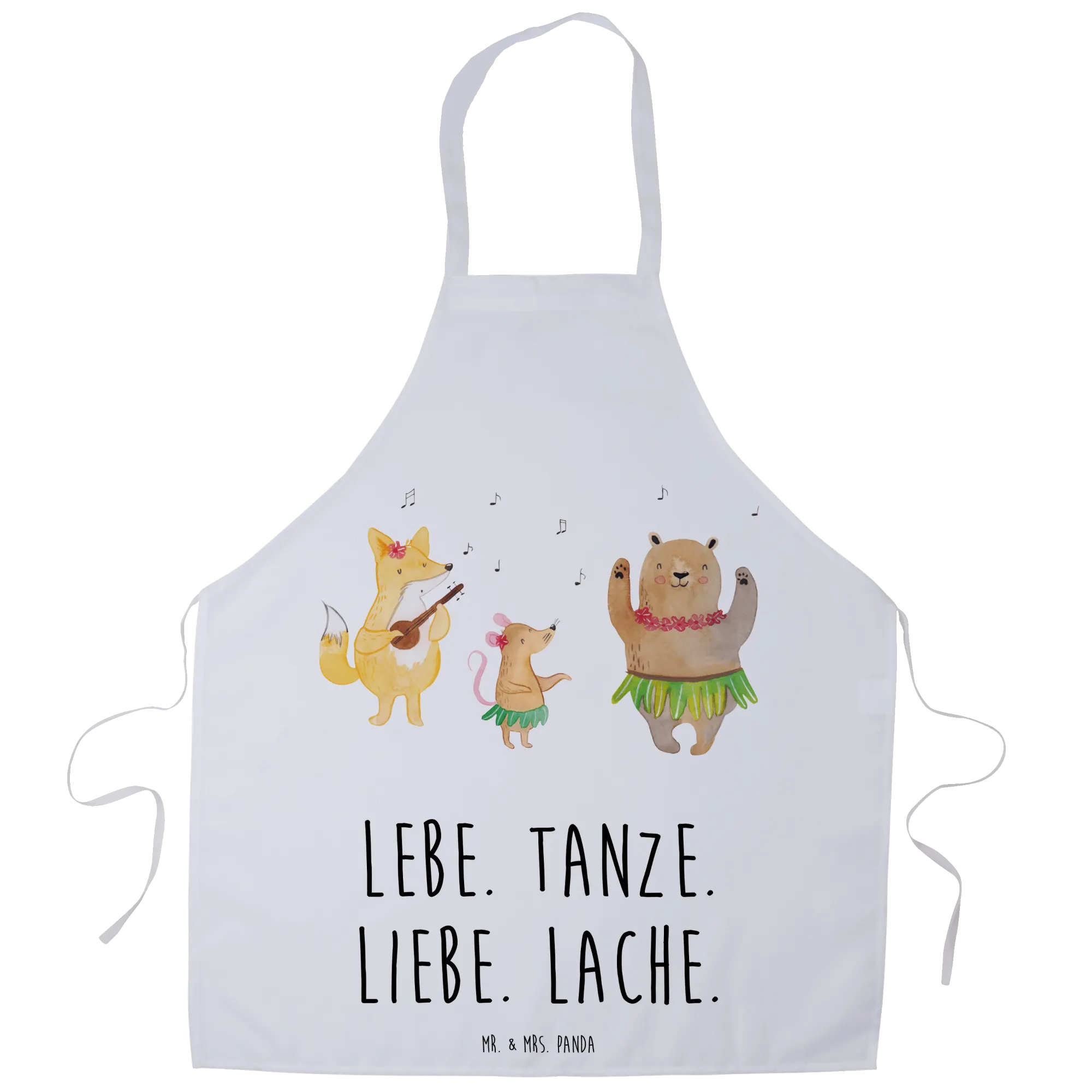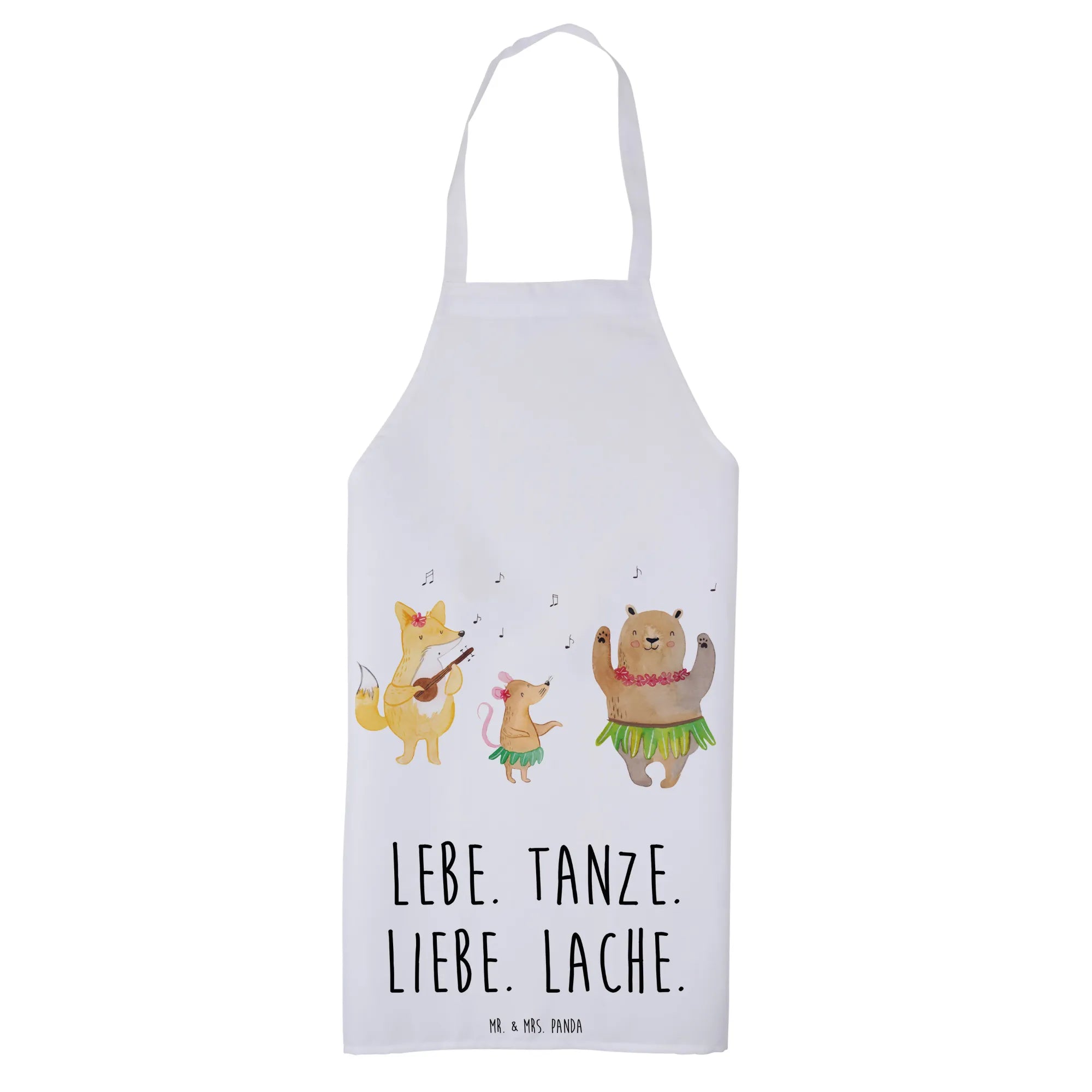 Die Designs von Mr. & Mrs. Panda erzählen kleine, bunte Geschichten. Der Slogan „Lebe. Tanze. Liebe. Lache." fängt die lebensfrohe Stimmung dieser Kollektion ein und macht die Schürze zu einem echten Lieblingsstück.