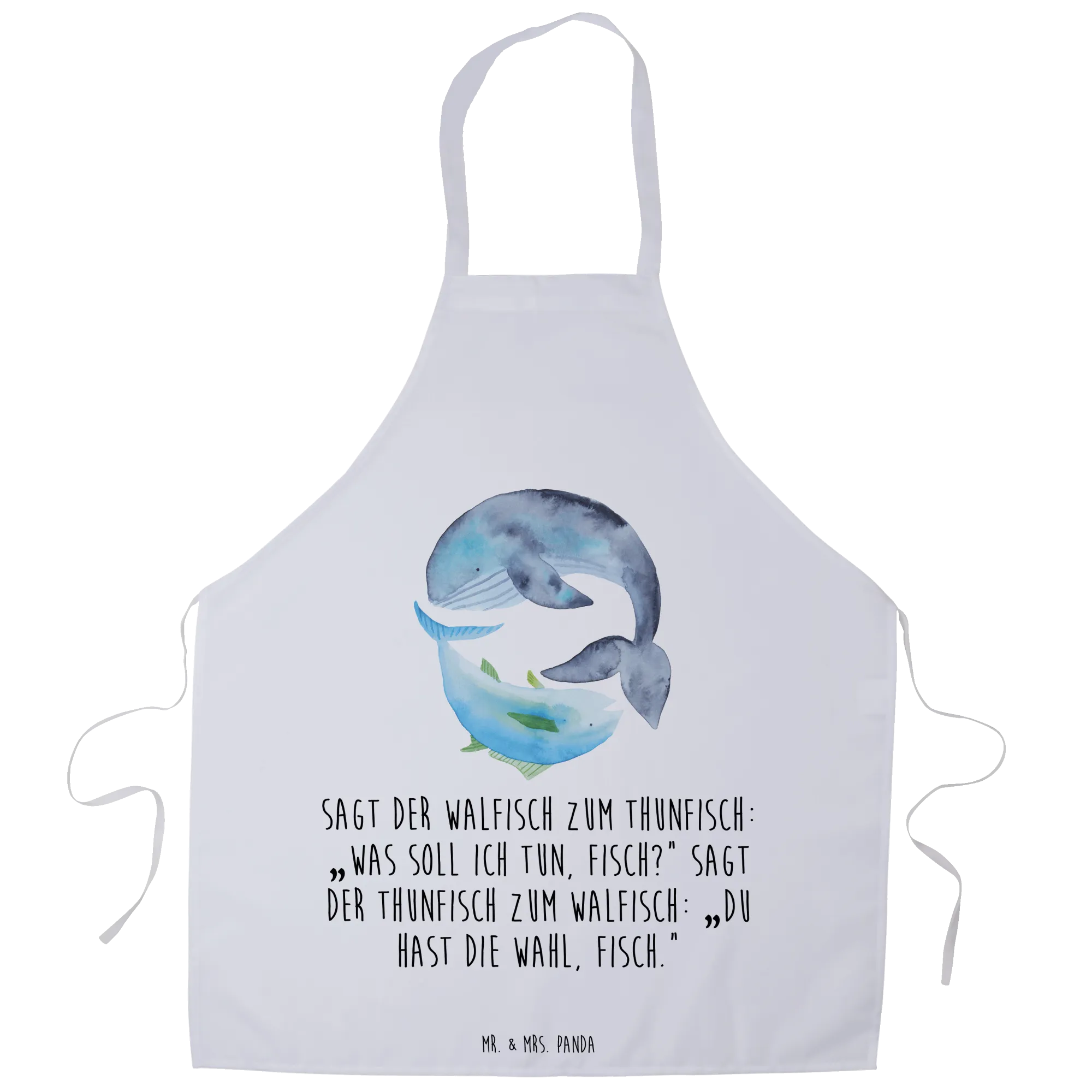 Die wunderschöne Kochschürze Walfisch & Thunfisch aus der beliebten Small World Kollektion von Mr. & Mrs. Panda ist das perfekte Geschenk für alle, die das Kochen, Backen oder Grillen lieben! Mit ihrem humorvollen Spruch "Sagt der Walfisch zum Thunfisch: „Was soll ich tun, Fisch?“ Sagt der Thunfisch zum Walfisch: „Du hast die Wahl, Fisch." zaubert diese Schürze jedem ein Lächeln ins Gesicht und bringt gute Laune in die Küche.
