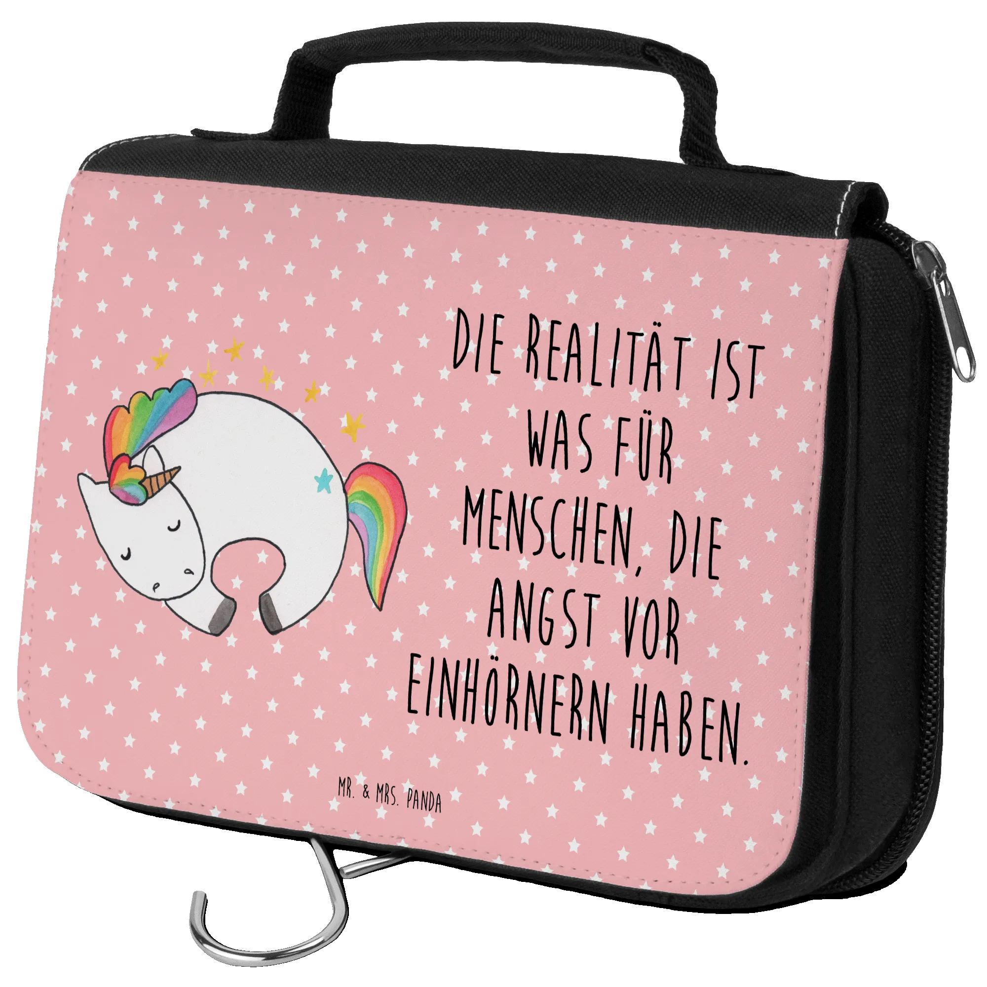 Der Kulturbeutel Einhorn Nacht von Mr. & Mrs. Panda ist der perfekte Begleiter für alle Einhorn-Liebhaber, die bei ihren Reisen nicht auf einen Hauch von Magie verzichten möchten. Mit einem charmanten Motiv, das ein träumendes Einhorn zeigt, weckt dieser Kulturbeutel in dir die Sehnsucht nach der zauberhaften Welt der Einhörner. Die Weisheit des Spruchs „Die Realität ist was für Menschen, die Angst vor Einhörnern haben“ begleitet dich und macht jeden Moment beim Entpacken deiner Kosmetikartikel zu einem kleinen Abenteuer.
