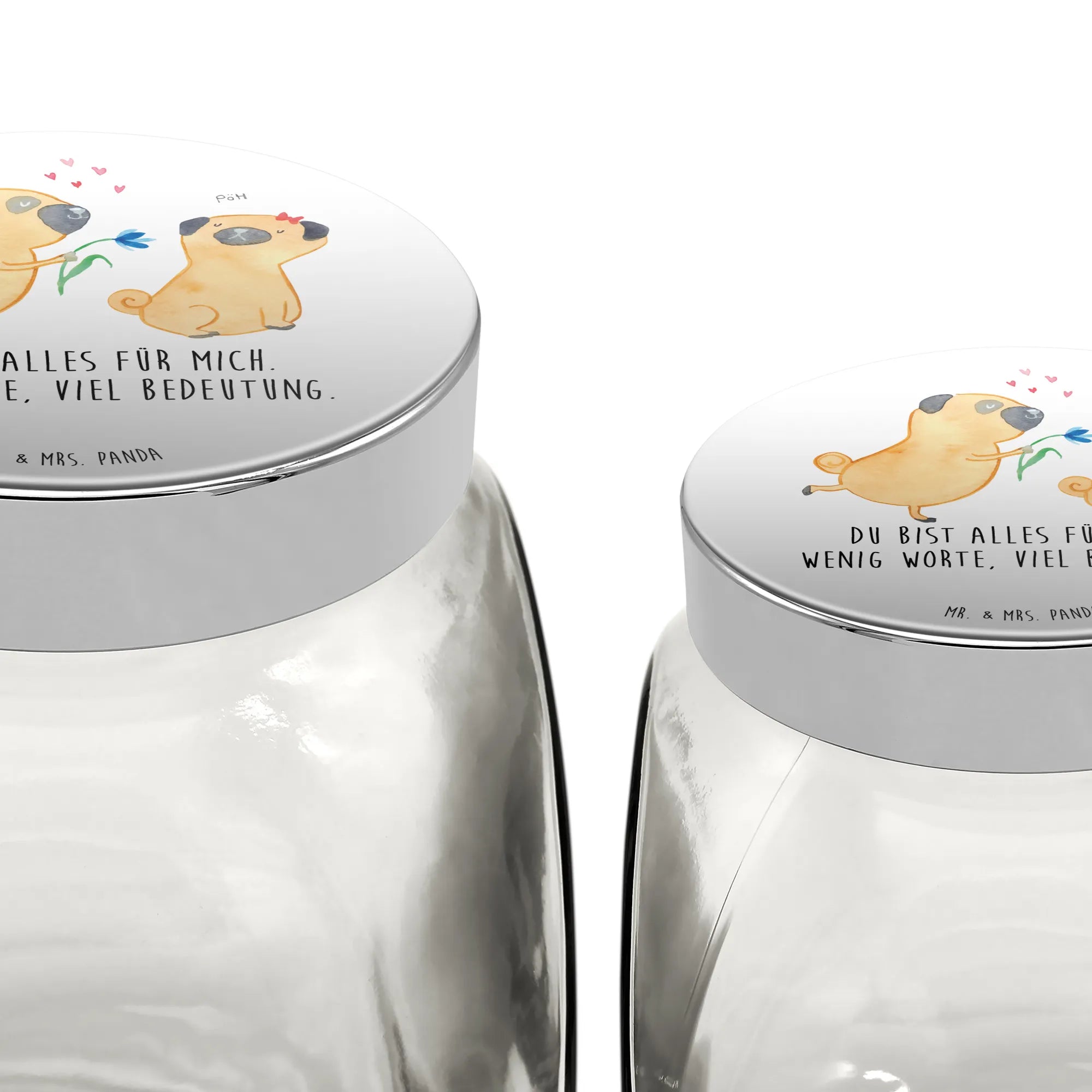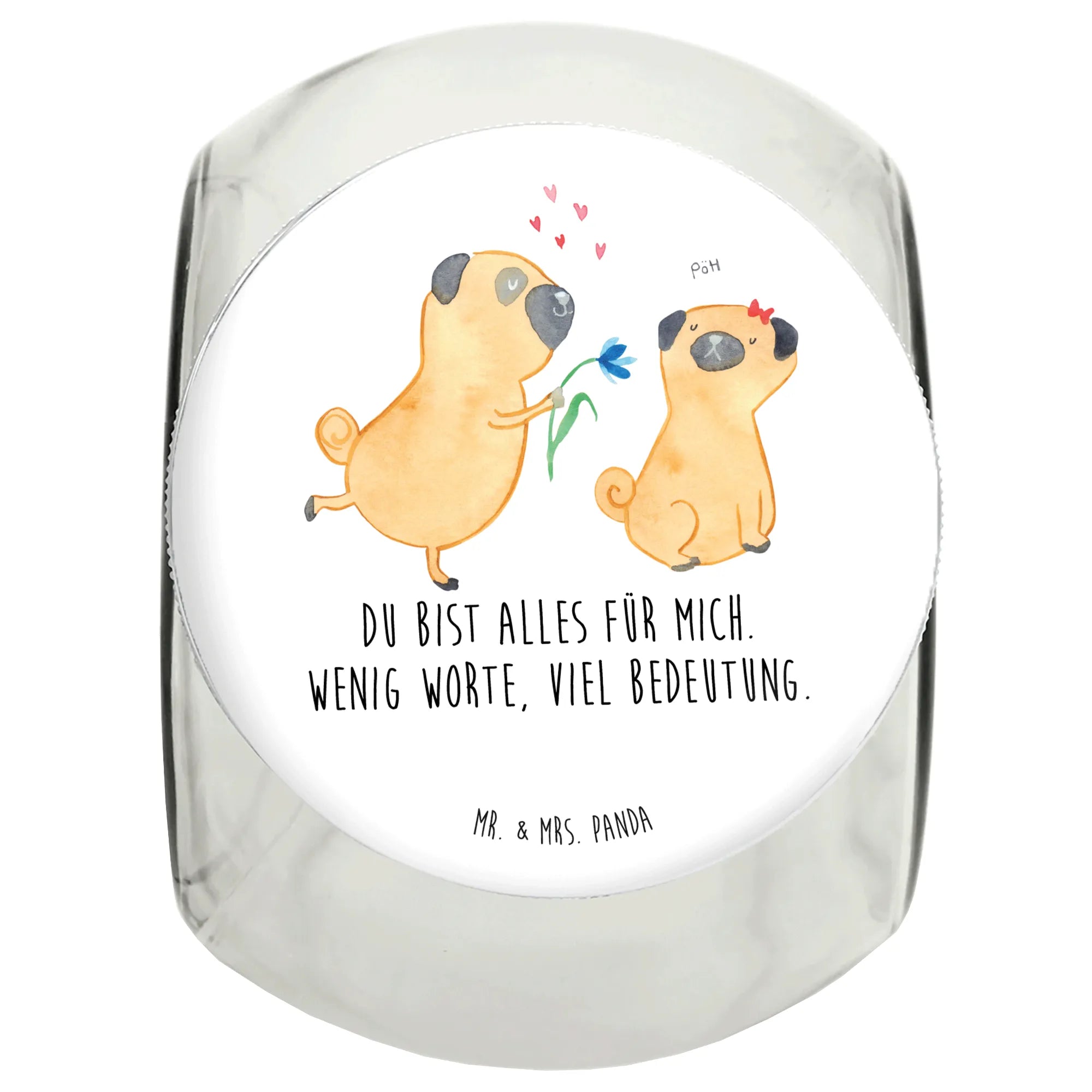 Das Leckerli Glas "Mops verliebt" von Mr. & Mrs. Panda ist das perfekte Geschenk für alle Hundeliebhaber. Mit seiner charmanten Darstellung von zwei niedlichen Möpsen, die sich verliebt anschauen, und dem liebevollen Spruch "Du bist alles für mich. Wenig Worte, viel Bedeutung." ist dieses Glas nicht nur ein funktionales Aufbewahrungsgefäß für Hundeleckerlies, sondern auch ein Ausdruck der tierischen Zuneigung.