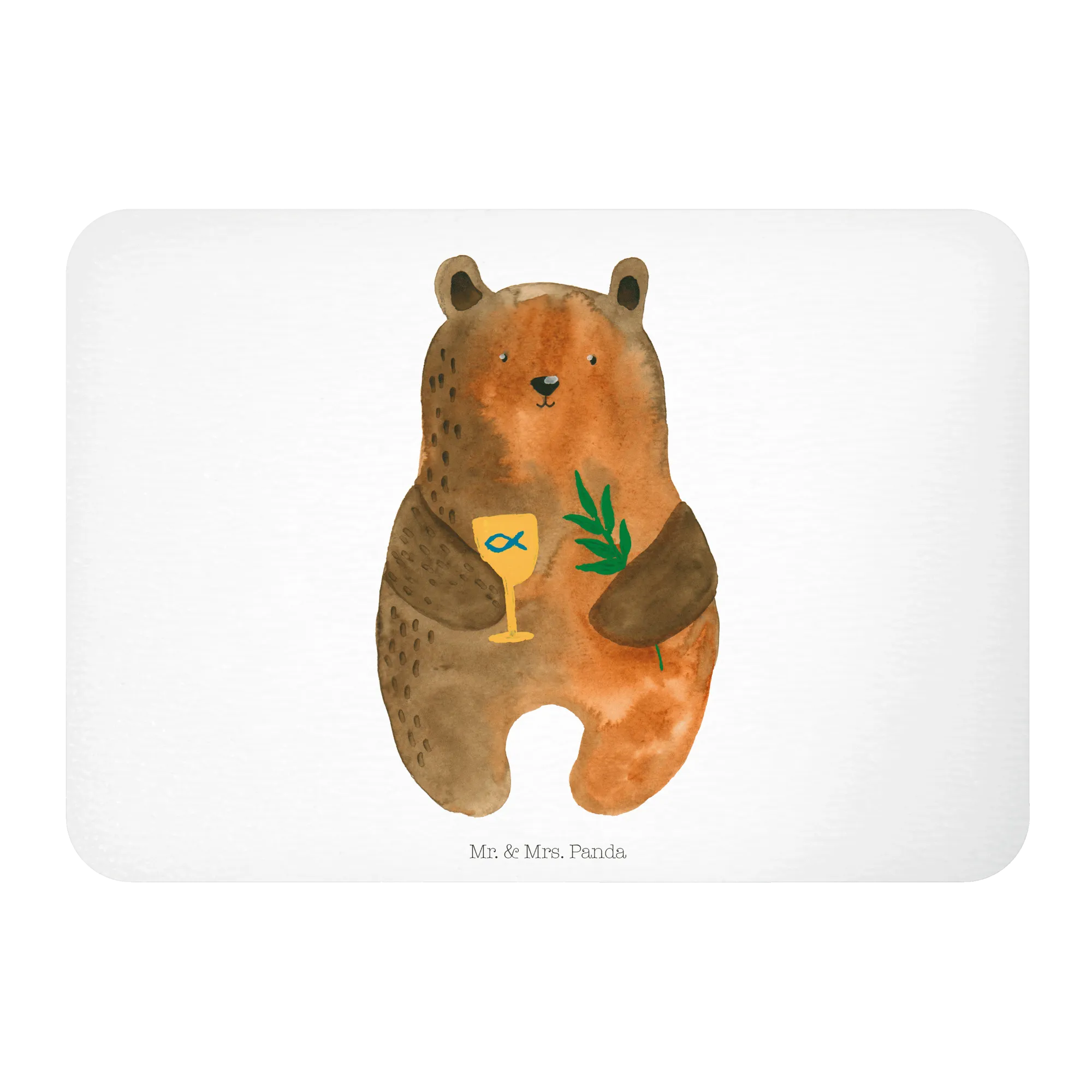 Der Bär wirkt wie ein treuer Begleiter, der dich durch den feierlichen Moment begleitet. Sein offenes Wesen vermittelt Sicherheit und Geborgenheit, genau das, was man sich an einem solchen Tag wünscht. Der Kelch erinnert an das gemeinsame Feiern im Gottesdienst, der Zweig an Hoffnung und Wachstum. Die Kombination ist schlicht und ausdrucksvoll zugleich — perfekt, um Emotionen zu transportieren, ohne sie zu überladen.
