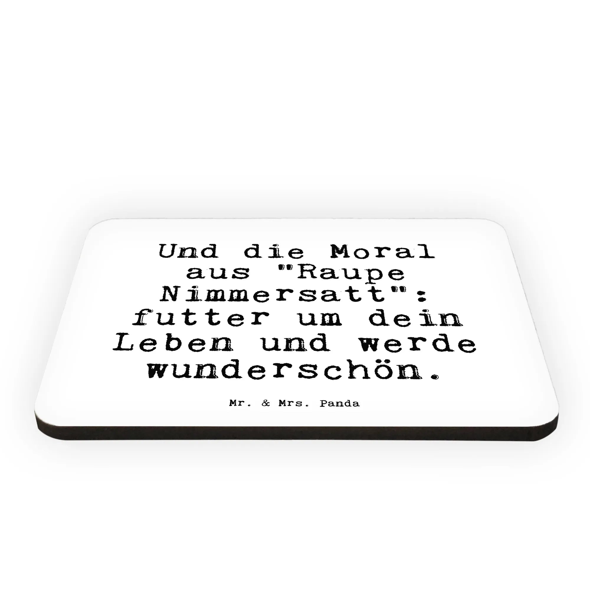 Dieser liebevoll gestaltete Kühlschrankmagnet von Mr. & Mrs. Panda trägt den zauberhaften Spruch "Und die Moral aus 'Raupe Nimmersatt': futter um dein Leben und werde wunderschön.".