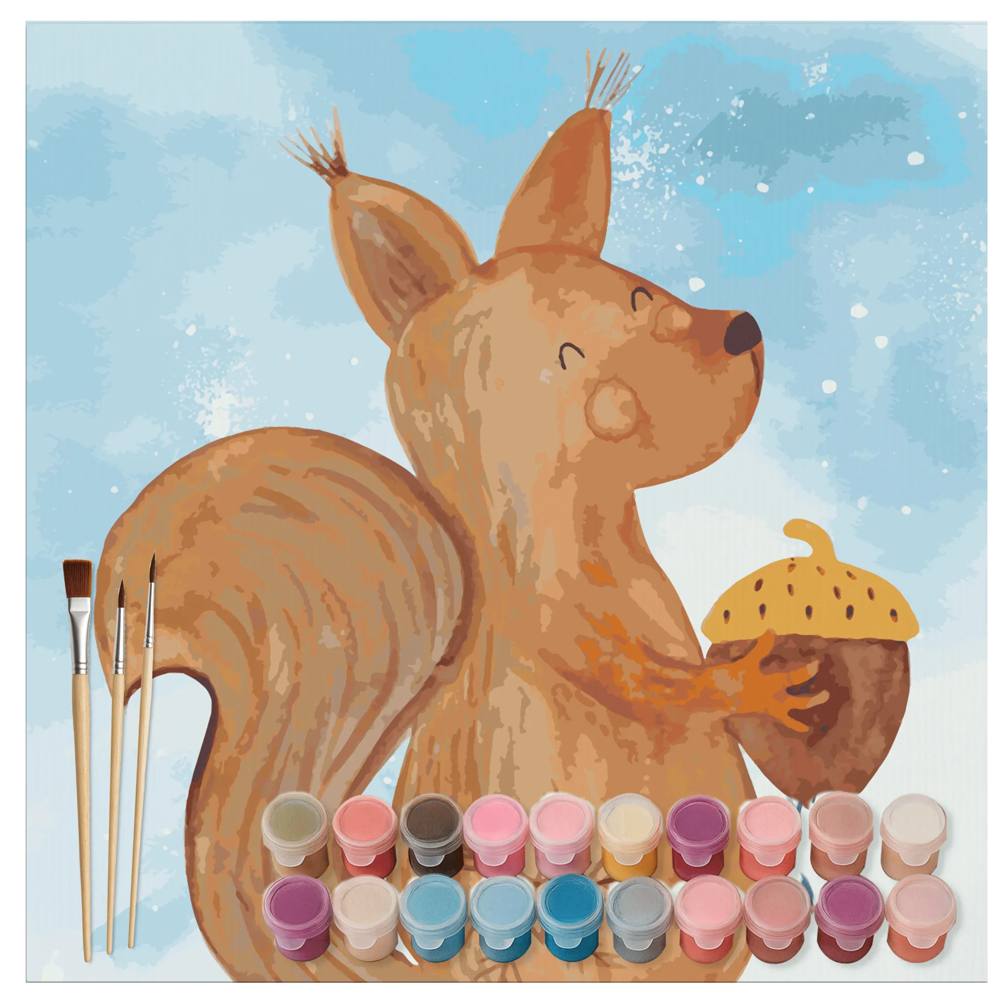 Das Bild zeigt ein niedliches Eichhörnchen in warmen, erdigen Farben, das mit einer Eichel in der Hand, zufrieden wirkt und eine friedliche Weihnachtsstimmung verbreitet. Mit hochwertiger Acrylfarbe, die eine perfekte Leuchtkraft aufweist, und den drei formstabilen Kunsthaarpinseln, die dir eine sichere Pinselführung garantieren, wird dein Projekt zu einem echten Erlebnis.