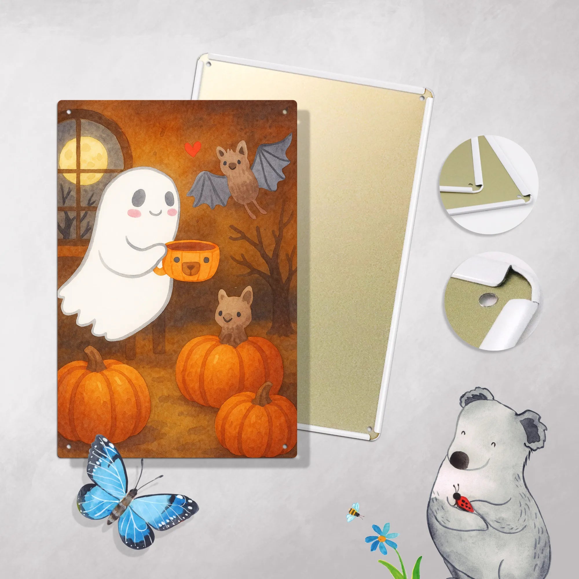 In dieser zauberhaften Darstellung sehen wir ein fröhliches Gespenst, das mit einem bezaubernden Kaffeebecher in der Hand schwebt. Die Tasse ist selbst ein kleines Gespenst und hat ein niedliches Gesicht, das gleich einen Lächeln zaubert. Neben unserem geisterhaften Freund schwirrt eine kleine, freundliche Fledermaus umher, die mit liebevollen Augen ihren Kumpel betrachtet. Über ihr schwebt ein rotes Herz, das die warme und herzliche Atmosphäre perfekt untermalt. Die sanften Farben und der verspielte Stil vermitteln ein Gefühl von Gemütlichkeit und Freude. Ob beim Kaffee oder beim Chillen – dieses Motiv ist einfach ideal für alle, die ein bisschen Magie und Spaß in ihren Alltag bringen möchten. Es spricht die Herzen der Betrachter an und lässt die eigene Fantasie lebendig werden.