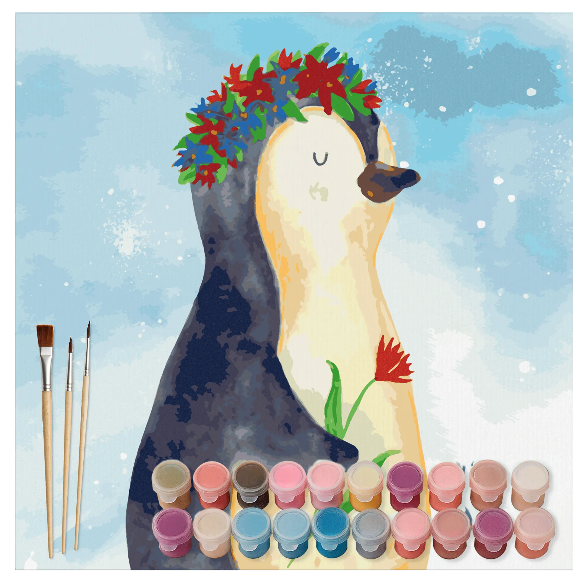 Das Malen nach Zahlen Set mit dem süßen Pinguin Blumenkranz von Mr. & Mrs. Panda ist mehr als nur ein kreatives Projekt – es ist ein Erlebnis! Mit diesem Set kannst du die Freude am Malen neu entdecken und deiner Kreativität freien Lauf lassen.