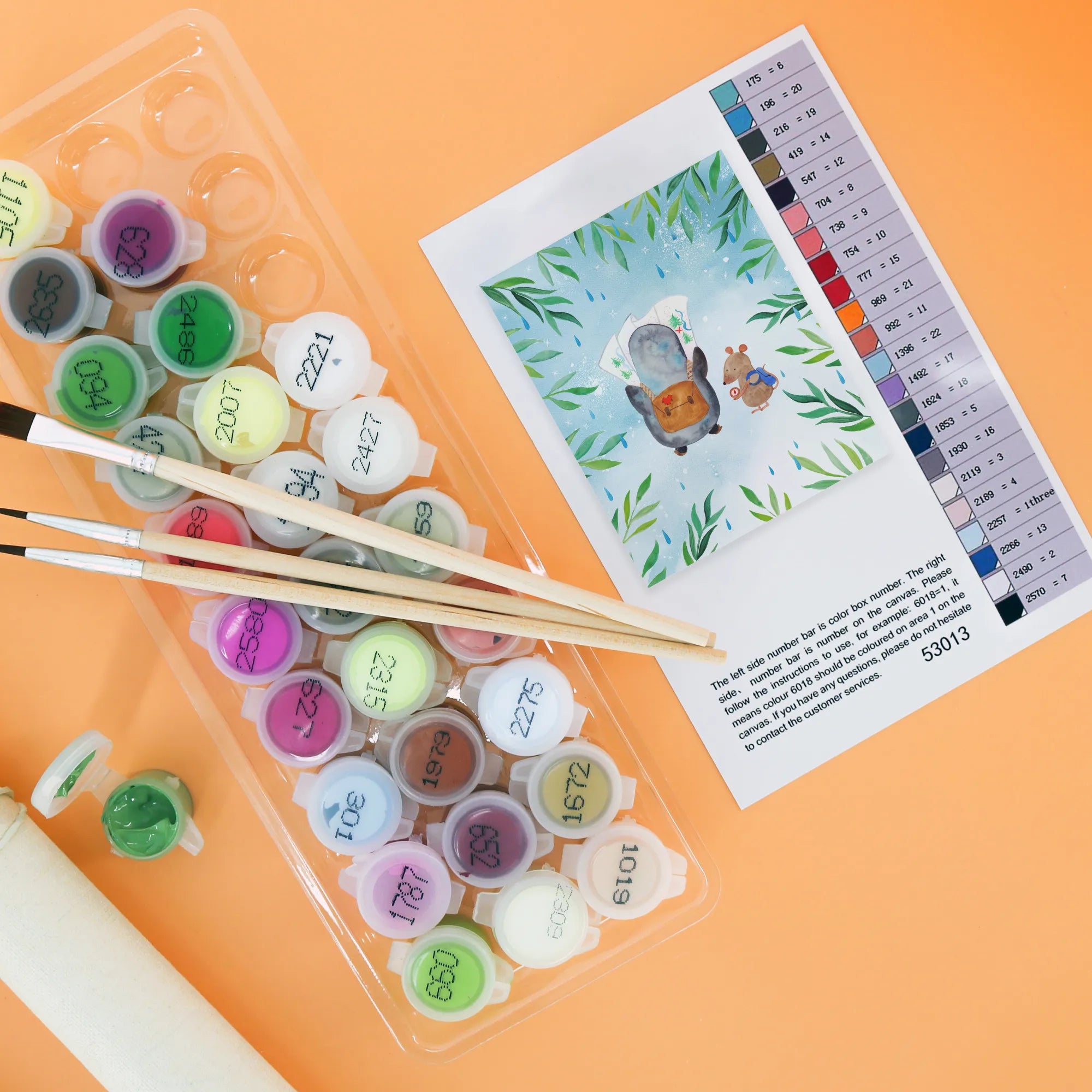 Das Set enthält hochwertige Acrylfarben in leuchtenden Farben, die ein ganz besonderes Mal-Erlebnis bieten. Ob du ein Anfänger mit 24 Farben bist oder bereits etwas mehr Erfahrung mit 36 Farben hast, der Spaß bleibt gleich. Jeder Pinselstrich hilft dir, die kleinen Details und die liebevollen Charakterzüge deines Motives zu erfassen.