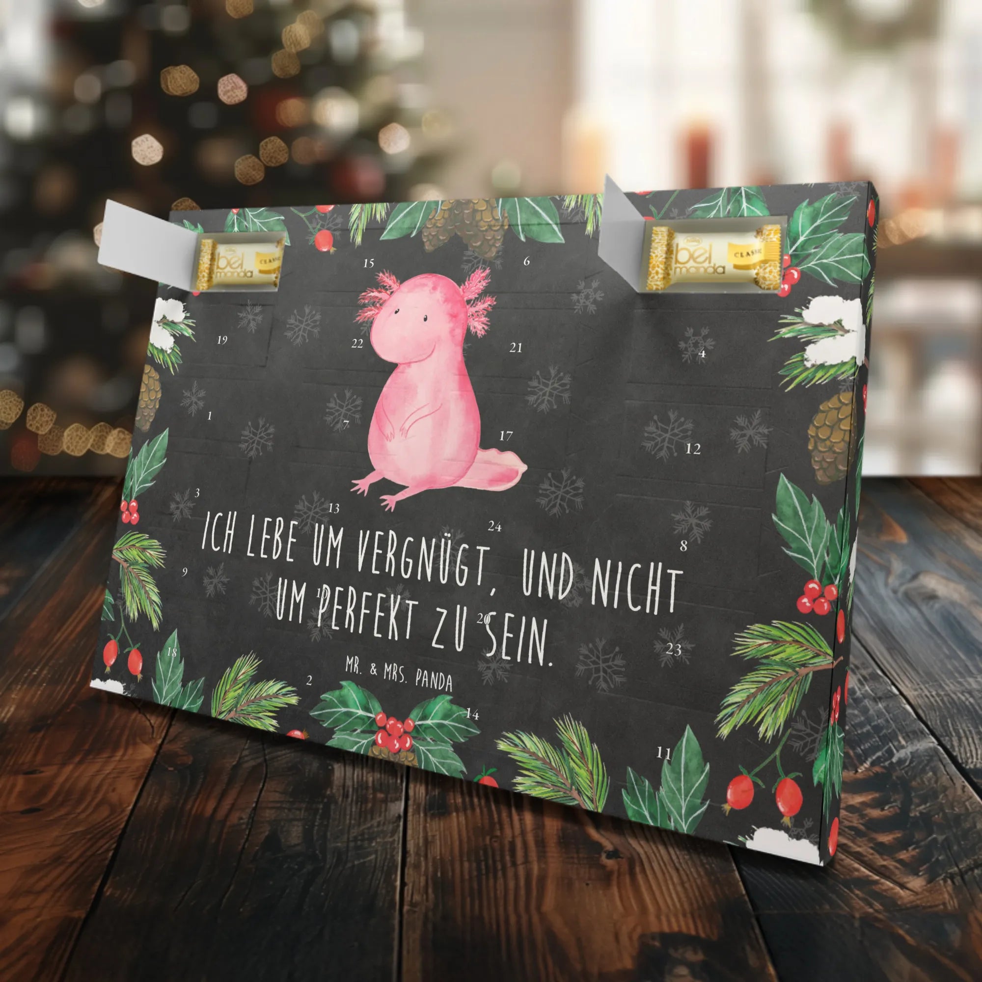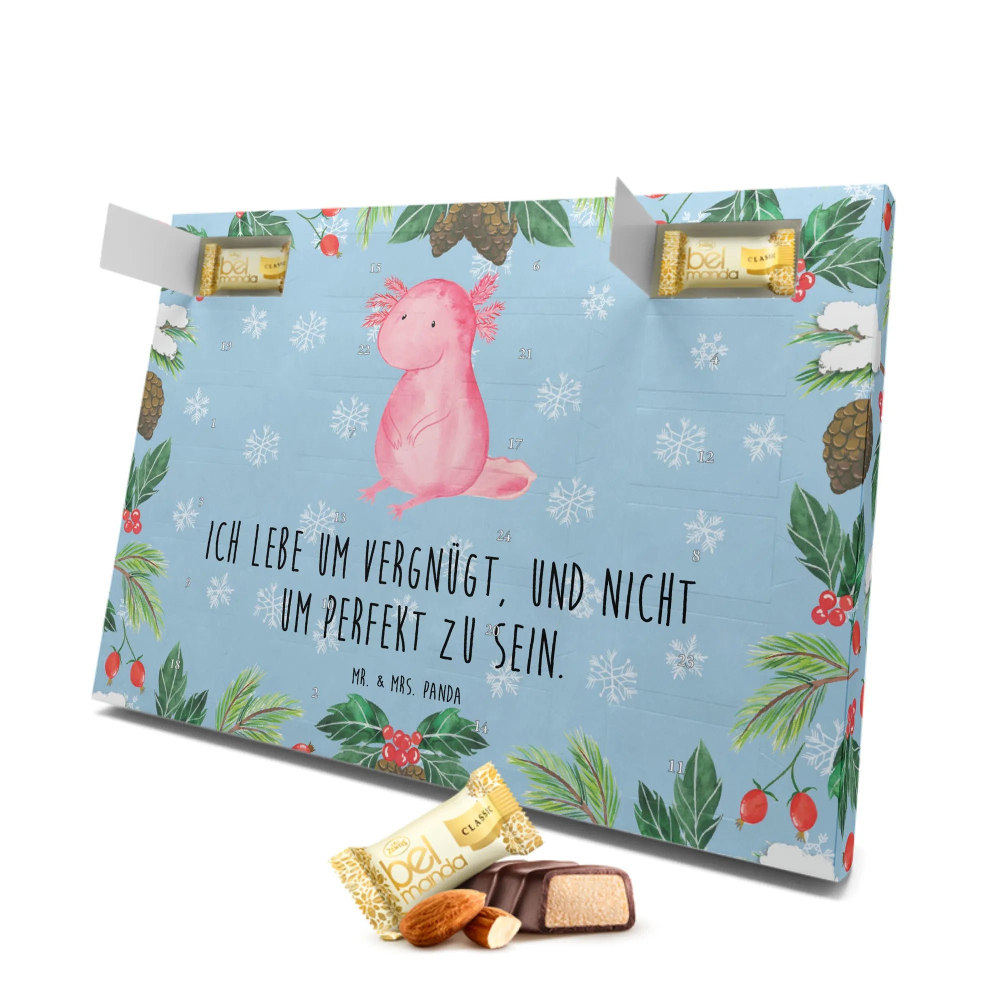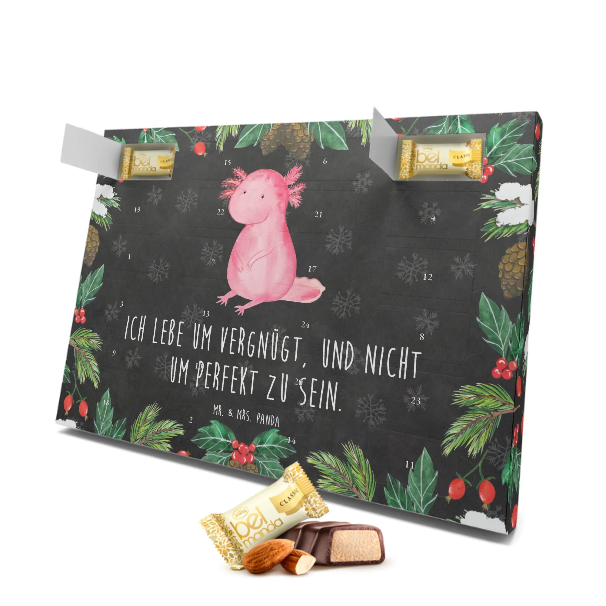 Der wunderschöne Marzipan Adventskalender Axolotl von Mr. & Mrs. Panda ist das perfekte Geschenk für all jene, die das Besondere lieben! Mit seinem liebevoll gestalteten Motiven und dem inspirierenden Spruch "Ich lebe um vergnügt, und nicht um perfekt zu sein", bringt er nicht nur süße Leckereien in die adventliche Zeit, sondern auch ein wenig Lebensweisheit ins Herz.