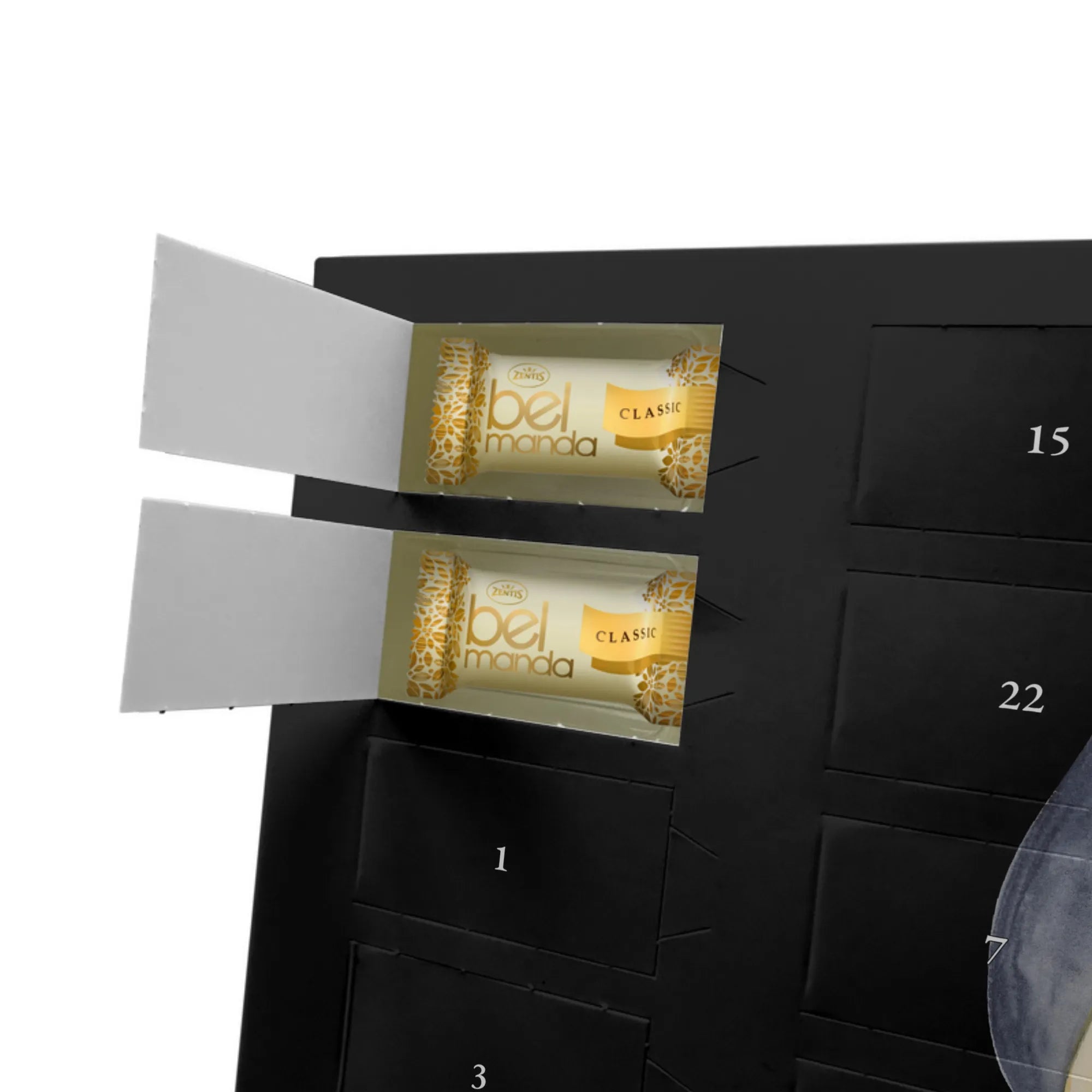 Der Adventskalender ist nicht nur optisch ein Hingucker, sondern verwöhnt auch den Gaumen mit 24 einzeln verpackten Edelmarzipan Pralinen. Diese zart schmelzenden Köstlichkeiten aus 29% Mandeln bringen Freude und Genuss in die Vorweihnachtszeit. Perfekt als Mitbringsel für die beste Freundin, als Geschenk für den Ehemann oder auch für Dich selbst, um die Vorfreude auf das Fest zu steigern.