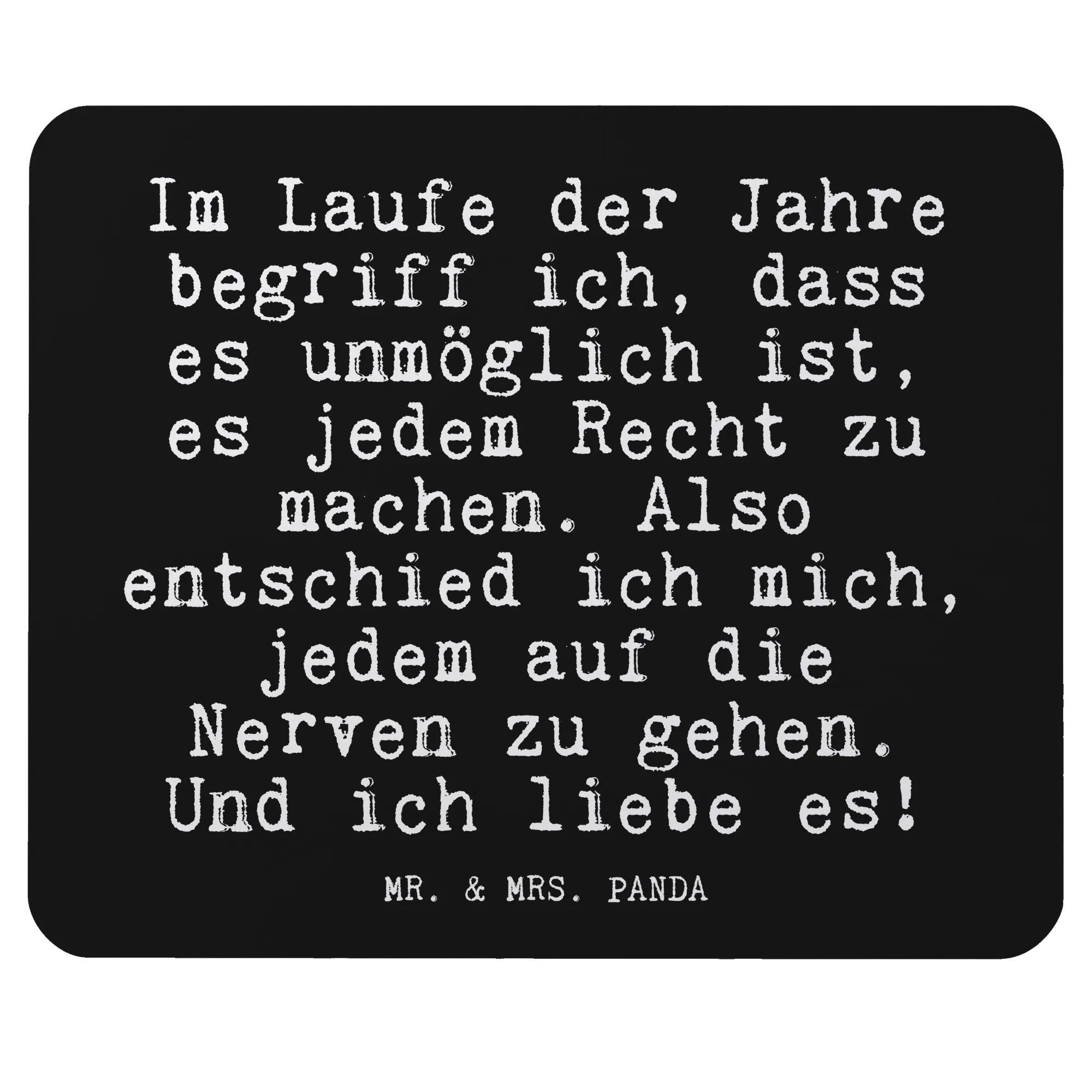 Das Mauspad "Im Laufe der Jahre begriff ich, dass es unmöglich ist, es jedem Recht zu machen. Also entschied ich mich, jedem auf die Nerven zu gehen. Und ich liebe es!" von Mr. & Mrs. Panda ist das perfekte Geschenk für all jene, die mit einem Hauch von Humor und Lebensfreude ihren Arbeitsalltag aufpeppen möchten. Es eignet sich hervorragend für Freundinnen, Kollegen oder einfach für sich selbst. Jeder, der das Leben in vollen Zügen genießt und nicht davor zurückschreckt, auch mal gegen den Strom zu schwimmen, wird mit diesem lustigen Mauspad seine Freude haben.