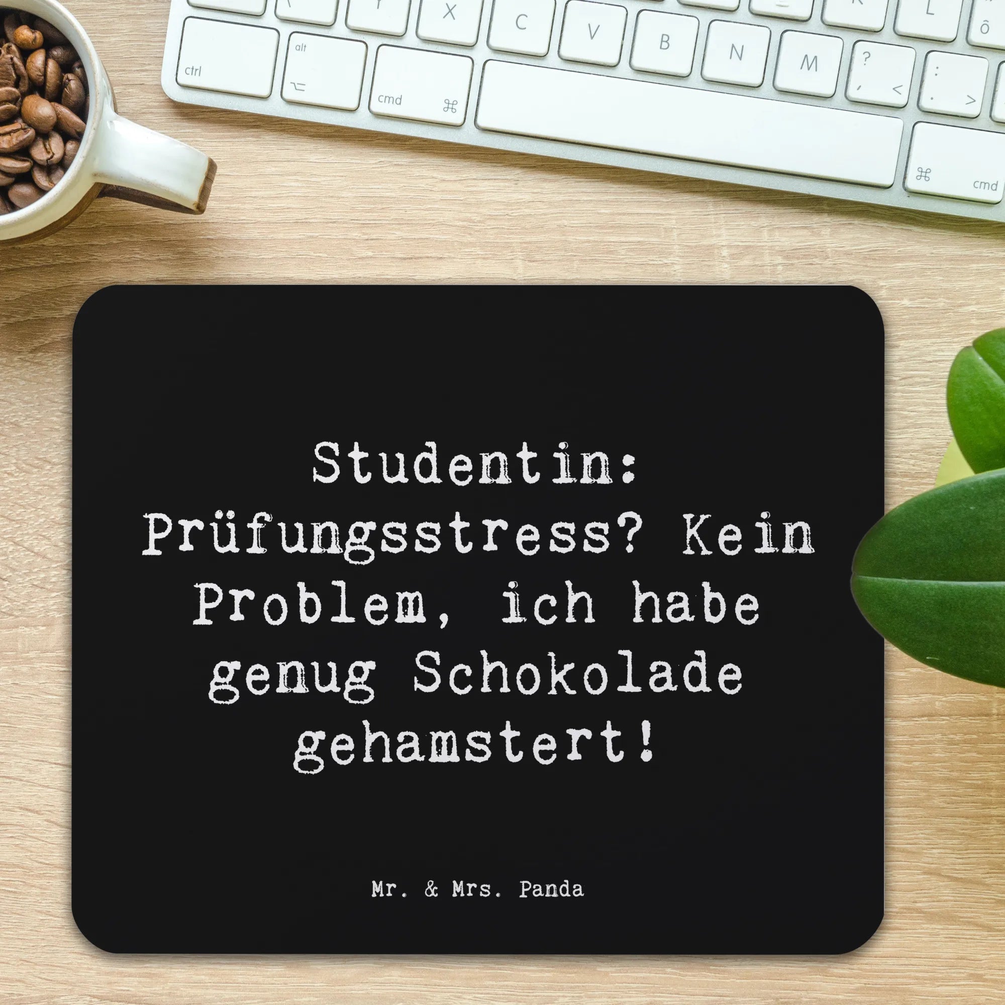 Das wunderschöne Mauspad "Studentin: Prüfungsstress? Kein Problem, ich habe genug Schokolade gehamstert!" von Mr. & Mrs. Panda ist nicht nur ein praktisches Büroaccessoire, sondern auch eine fröhliche Aufmunterung für alle Studentinnen, die in der stressigen Prüfungszeit ihren Kopf über Wasser halten müssen! Dieses einzigartige Mauspad ist die perfekte Geschenkidee für junge Frauen, die sich auf ihre Prüfungen vorbereiten, für Geburtstag, zu Weihnachten oder einfach als nette Geste zwischendurch. Mit seinem liebevollen und witzigen Spruch bringt es eine Portion Humor in den oft hektischen Studienalltag.