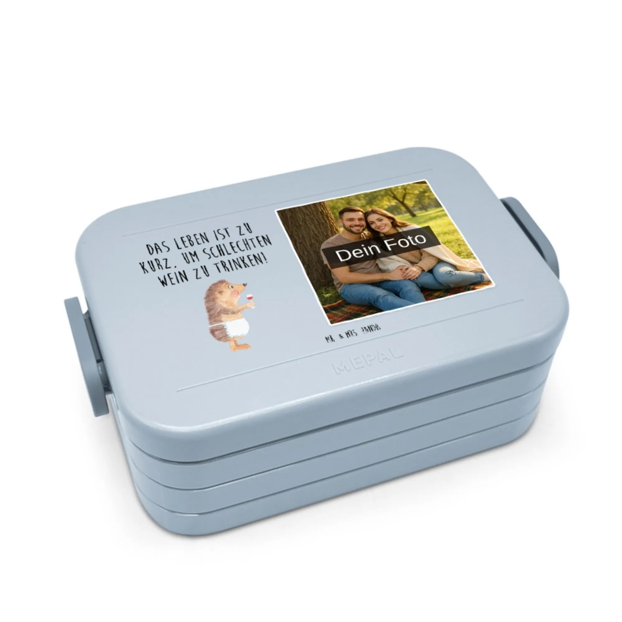Mepal Foto Bentobox – die personalisierte Bento-Brotdose von Mr. & Mrs. Panda, die dich jeden Tag begleitet. Wähle dein Wunschfoto und wir gestalten daraus eine Brotdose, die sonst keiner hat. Die Bento-Einsätze sind rausnehmbar, so bleibst du flexibel bei Snacks und Hauptmahlzeiten. Eine praktische Snackgabel ist dabei, damit nichts kleckert. Schüssel und Einsätze kannst du in der Mikrowelle erwärmen (ohne Deckel). Die Box ist BPA-frei, lebensmittelecht und spülmaschinenfest – perfekt für stressfreie Pausen. Erhältlich in den Farben Salbeigrün, Hellblau und Pastellrot. Technische Angaben: Größe 188 mm x 61 mm x 61 mm, Inhalt 900 ml, Gewicht 325 g. Gefertigt aus PP, TPE und ABS, mit einer Druckfläche von 130 mm x 79 mm für dein Motiv. Ob Schule, Uni, Büro oder Freizeit – mit der Mepal Foto Bentobox hast du eine zuverlässige, hübsche und persönliche Lösung für dein Essen.