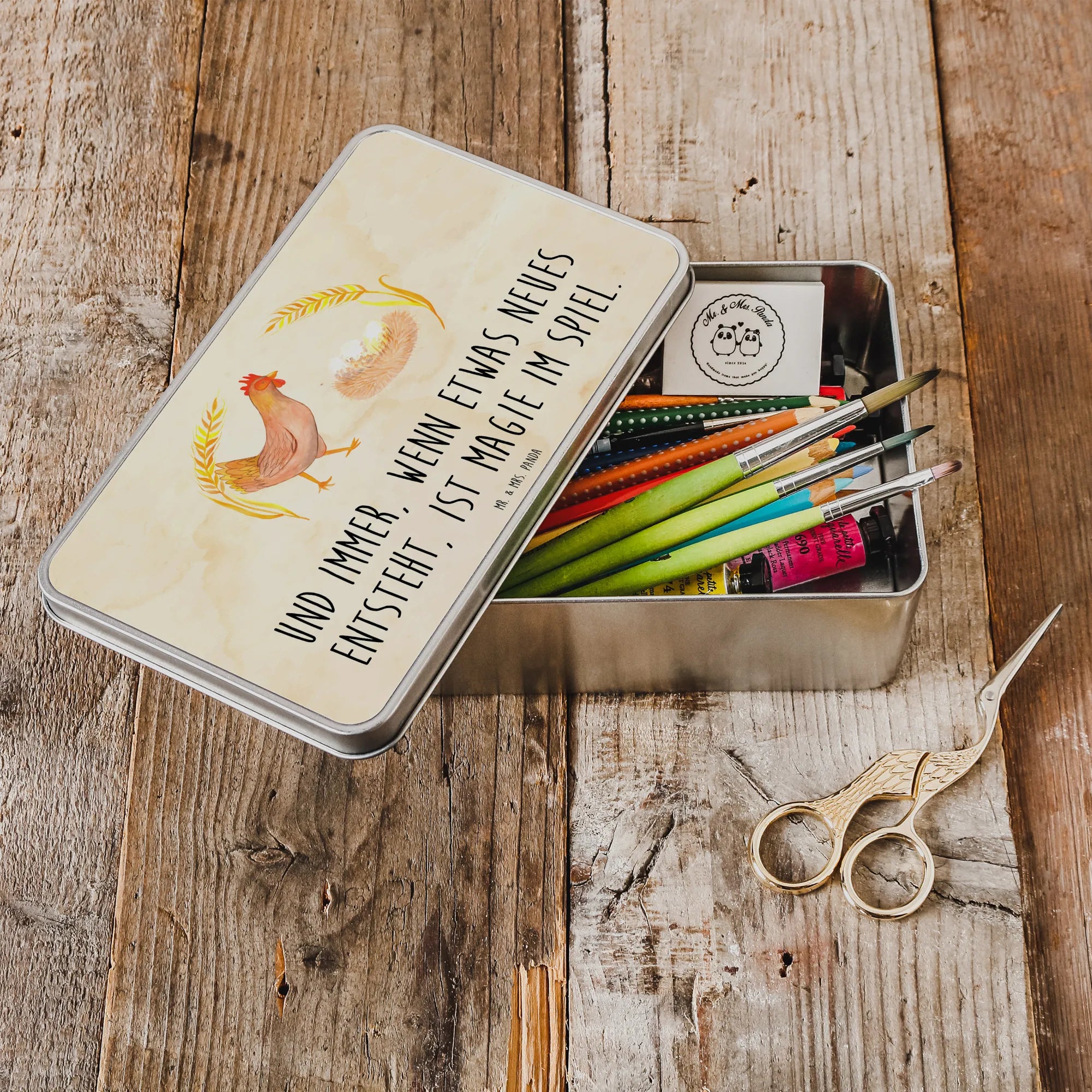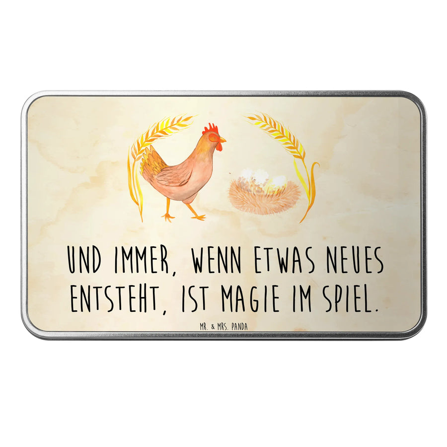 Die wunderschöne rechteckige Metalldose von Mr. & Mrs. Panda mit dem stolzen Huhn ist nicht nur ein Blickfang, sie ist auch die perfekte Aufbewahrungslösung für all deine Lieblingssnacks, Kekse oder kleine Erinnerungen. Aus hochwertigem Metall gefertigt, verbindet sie Funktionalität mit einem liebevollen Design, das jedes Herz höherschlagen lässt. Die Dose, farbenfroh bedruckt mit dem niedlichen Motiv "Huhn stolz" und dem Spruch "Und immer, wenn etwas Neues entsteht, ist Magie im Spiel", verkörpert das wunderbare Gefühl des Landlebens.