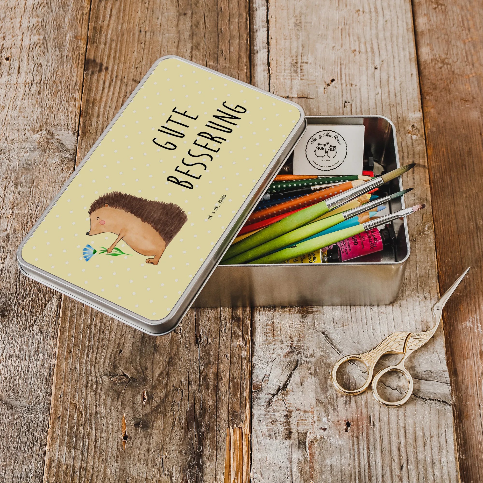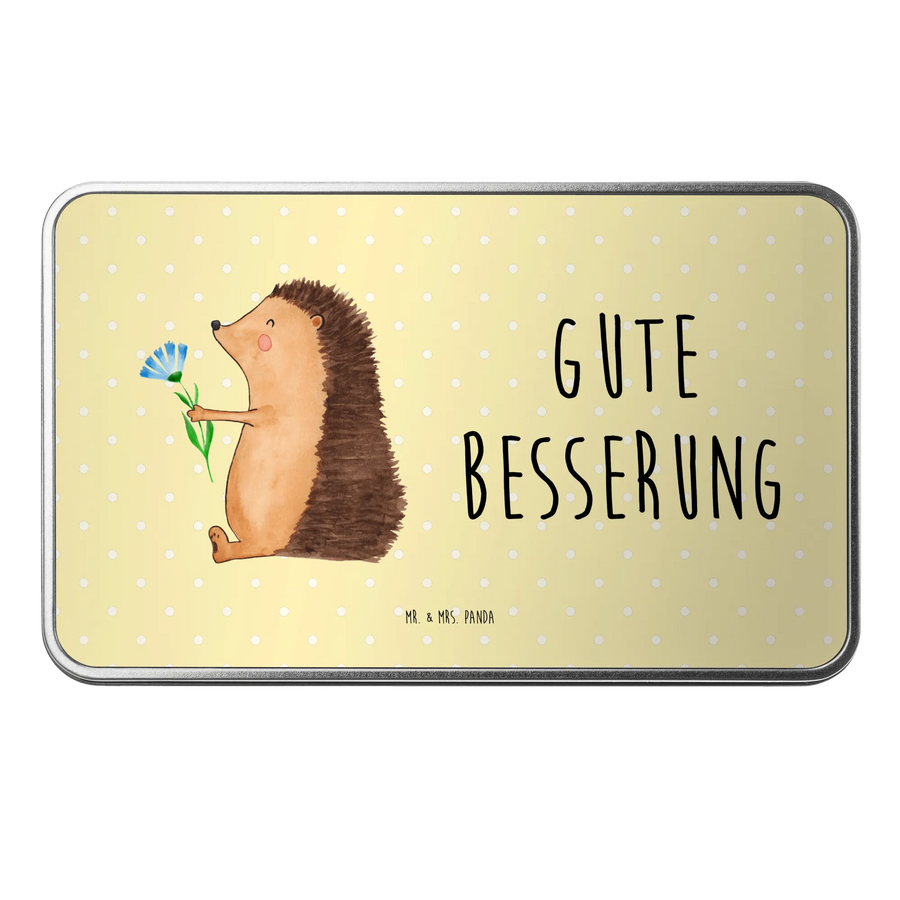 Unsere Metalldose besticht durch ihre besonders glänzende und hochwertige Ausführung aus langlebigem Metall, sodass sie nicht nur stabil, sondern auch ein echter Hingucker ist. Das liebevoll handgezeichnete Motiv zeigt einen putzigen Igel, der eine strahlend rote Blume in seinen Händen hält und ist damit ein idealer Begleiter für gemütliche Nachmittage oder als tolles Geschenk bei Genesungswünschen.