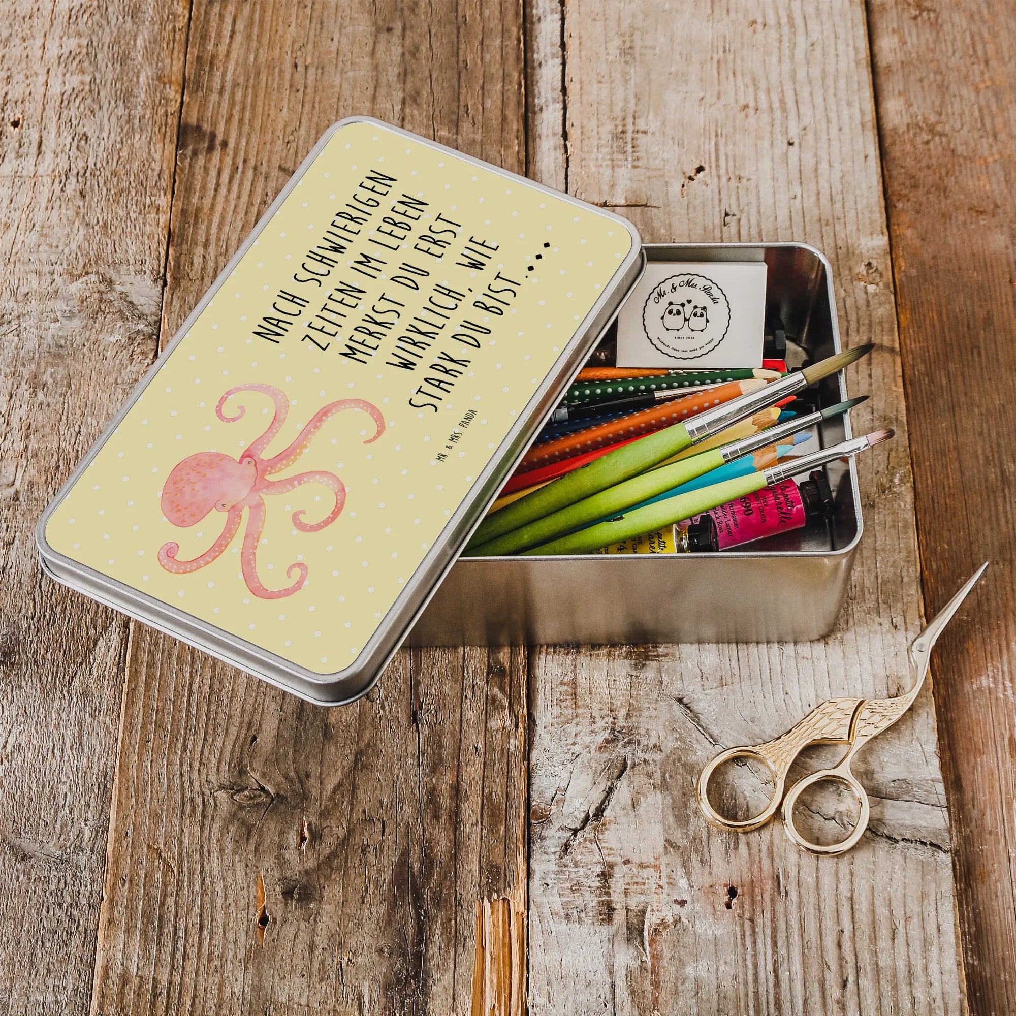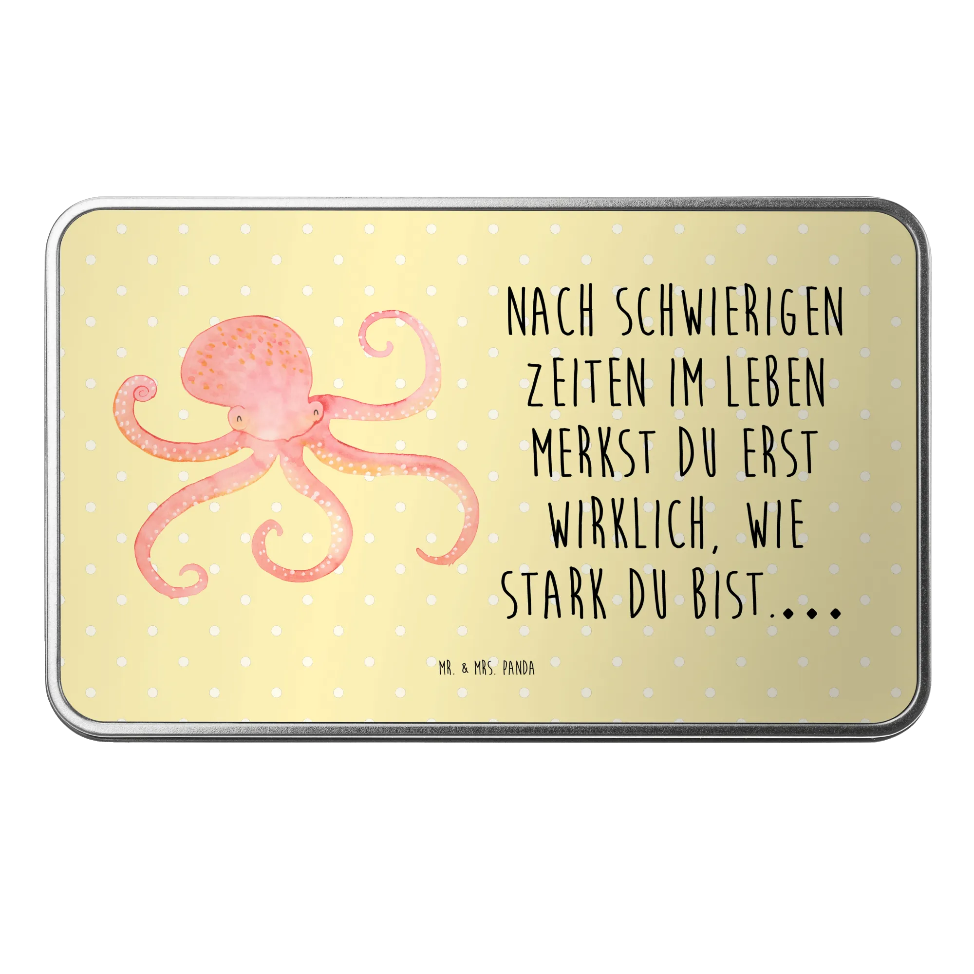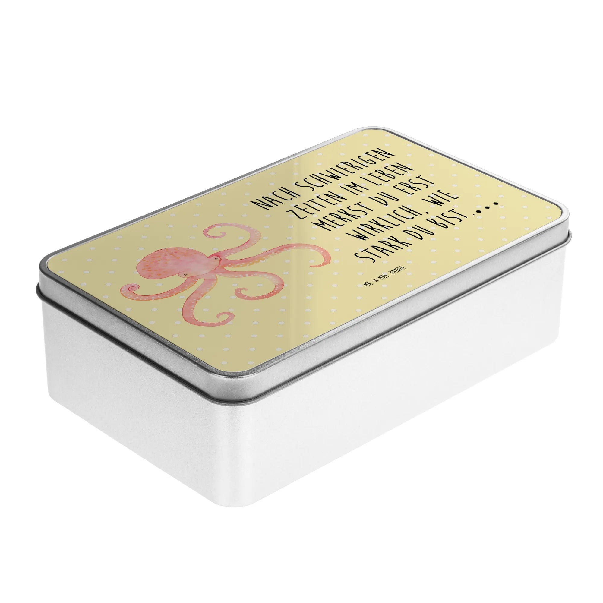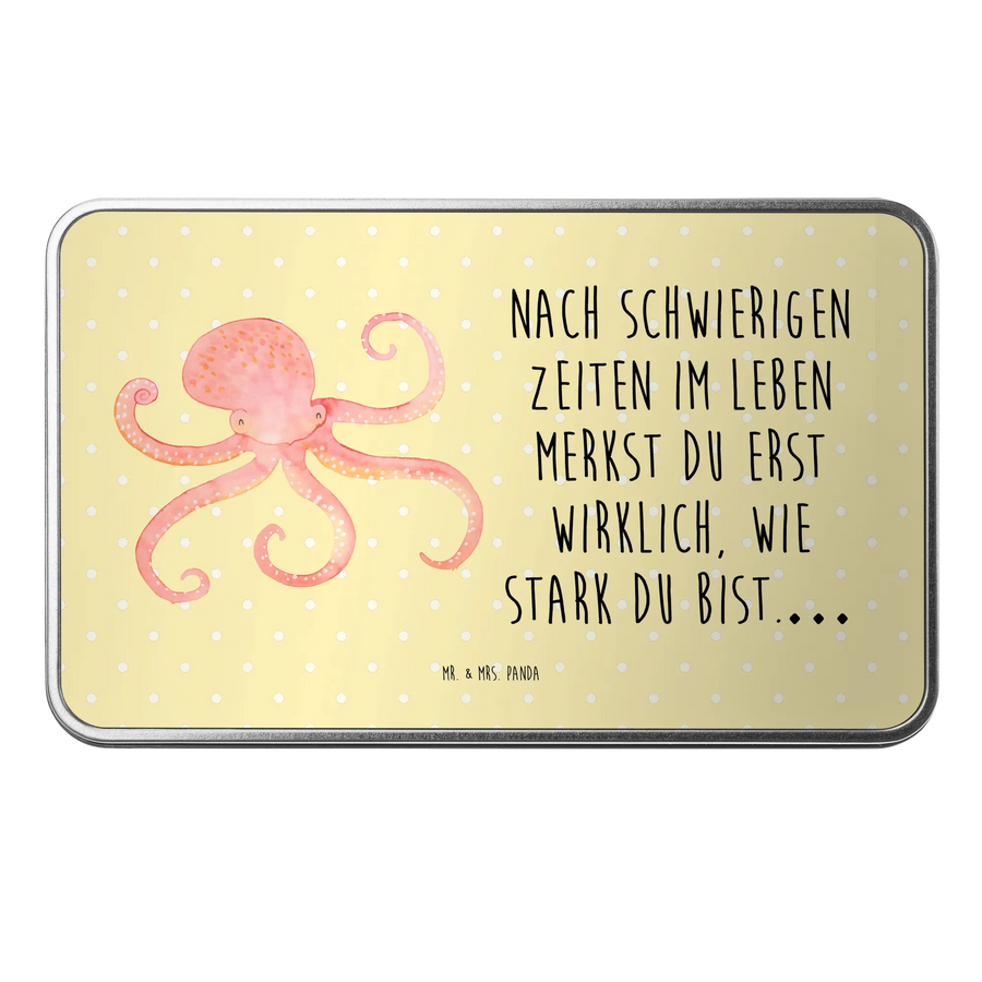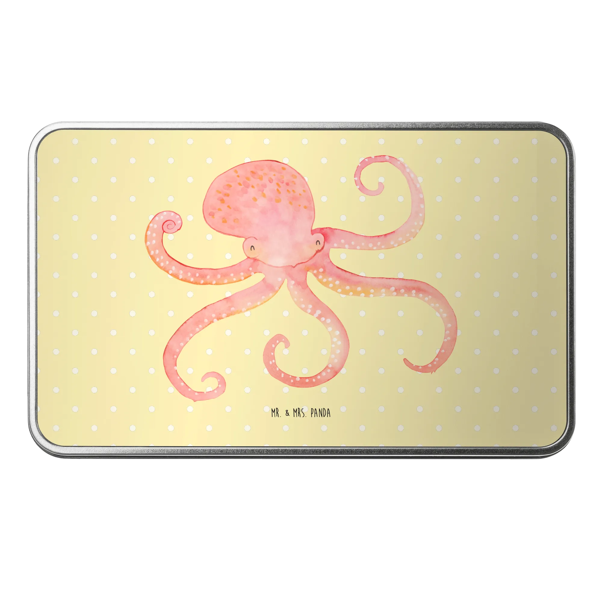 Die wunderschöne rechteckige Metalldose mit dem fröhlichen Tintenfisch-Motiv von Mr. & Mrs. Panda ist das perfekte Geschenk für alle, die Freude und gute Laune in ihrem Alltag schätzen.