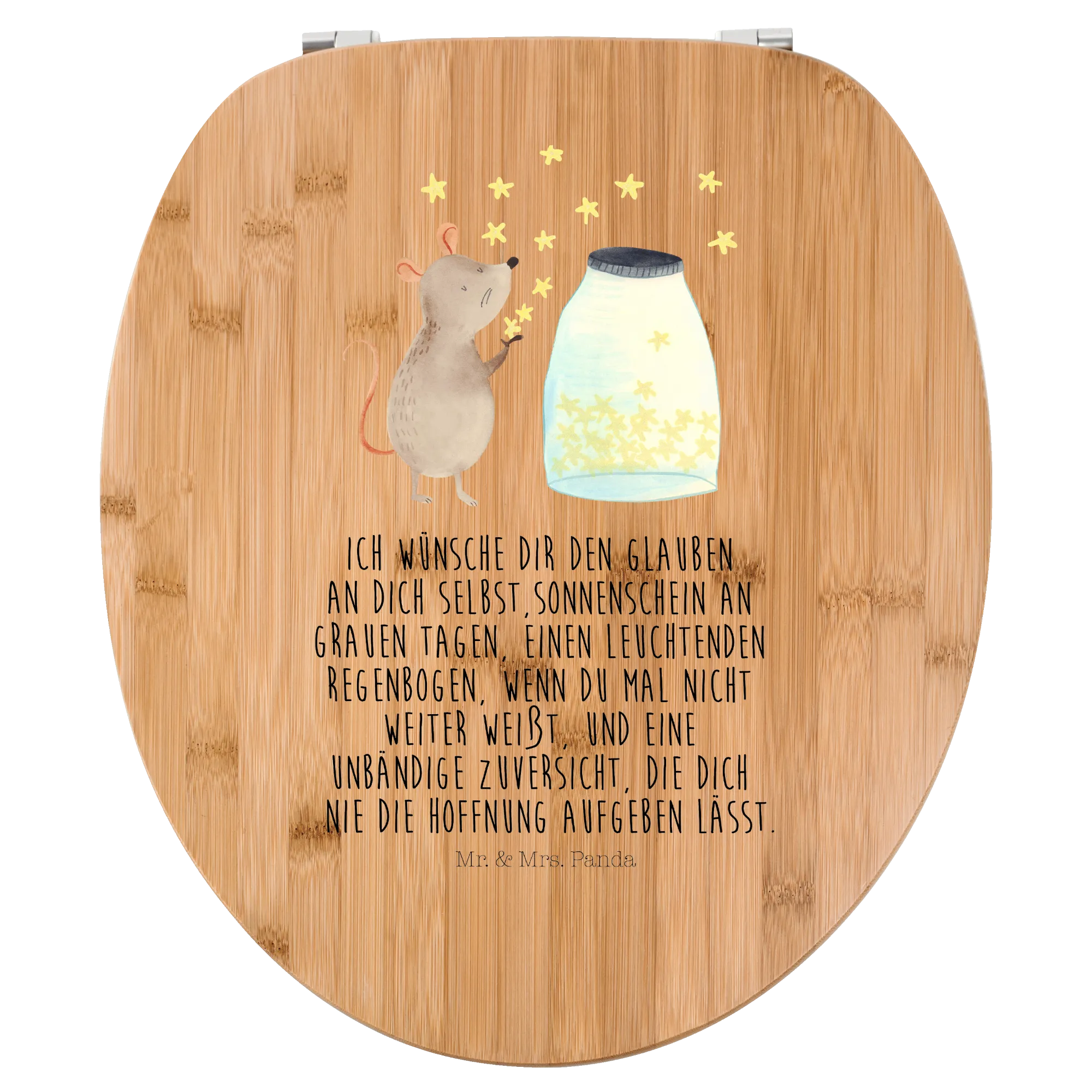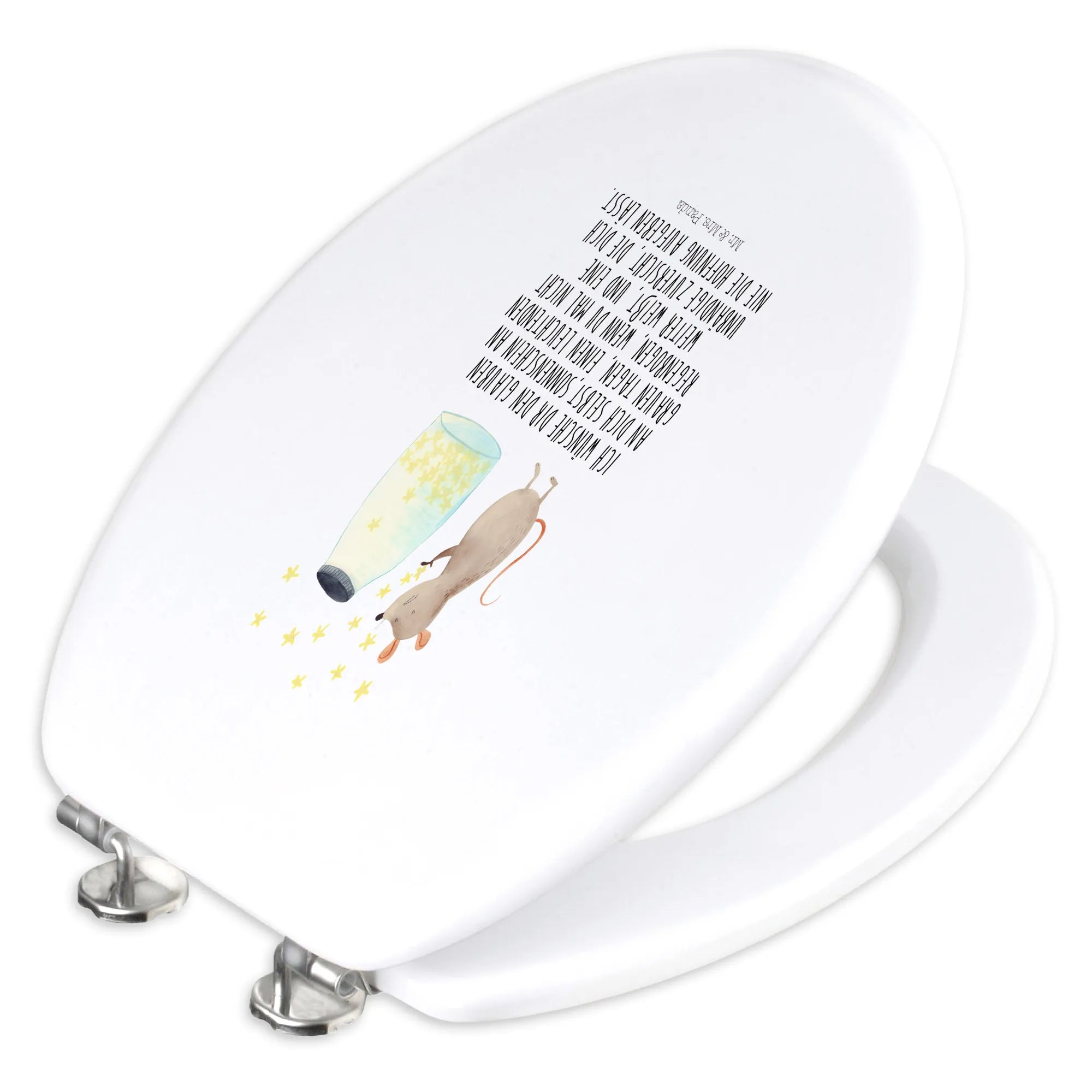 Dieser liebevoll gestaltete Toilettensitz mit der süßen Maus, die vor einem Glas funkelnder Sterne sitzt, bringt nicht nur Freude ins Badezimmer, sondern auch eine Portion gute Laune. Der Slogan, "Ich wünsche dir den Glauben an dich selbst, Sonnenschein an grauen Tagen, einen leuchtenden Regenbogen, wenn du mal nicht weiter weißt, und eine unbändige Zuversicht, die dich nie die Hoffnung aufgeben lässt", strahlt positive Energie aus und inspiriert die Kleinsten, ihre Träume zu verfolgen.