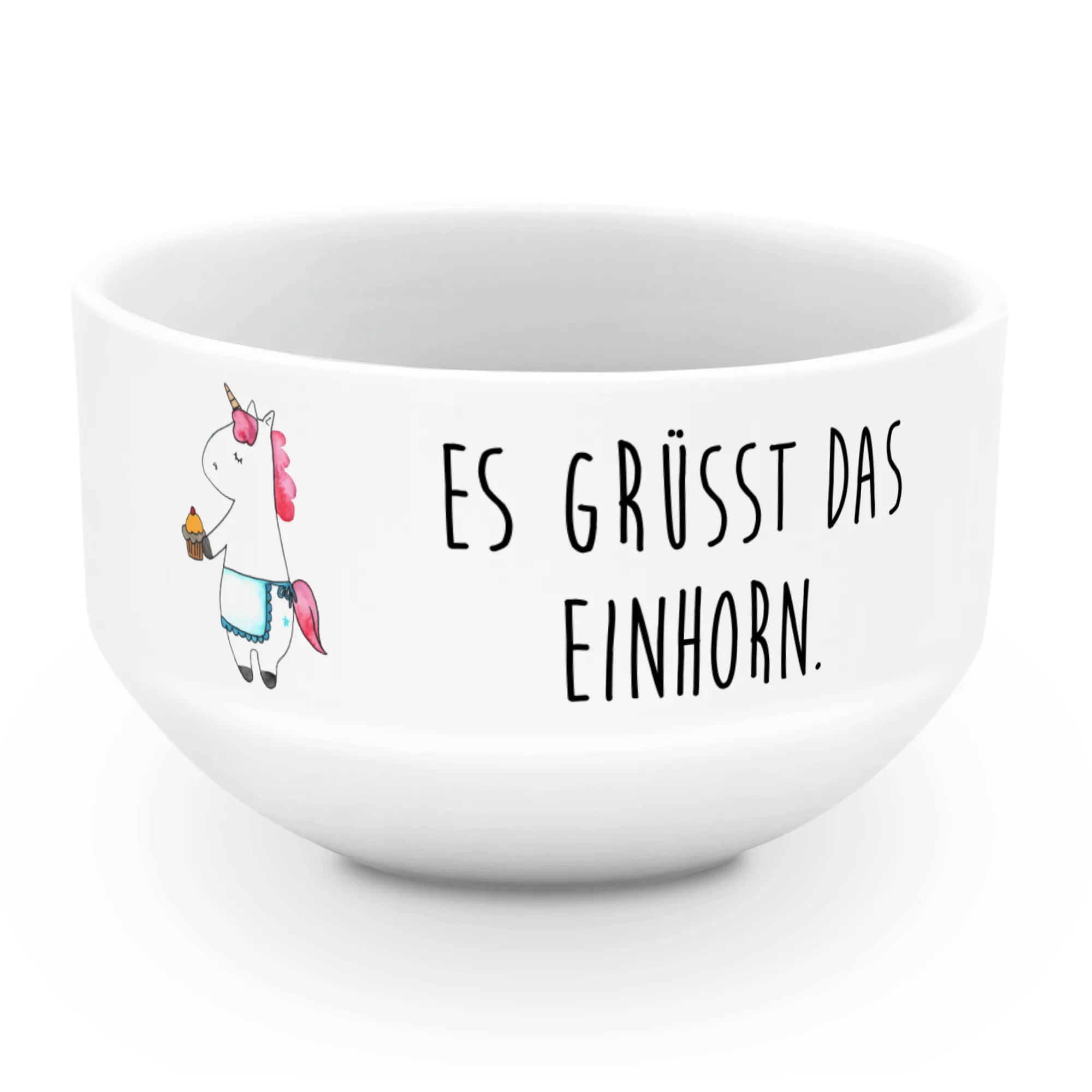 Das niedliche Einhorn mit seiner Schürze, das stolz einen selbstgebackenen Muffin präsentiert, sorgt für gute Laune am Frühstückstisch. Der spritzige Slogan "Es grüsst das Einhorn" rundet das Design ab und macht die Schüssel zu einem besonderen Hingucker.