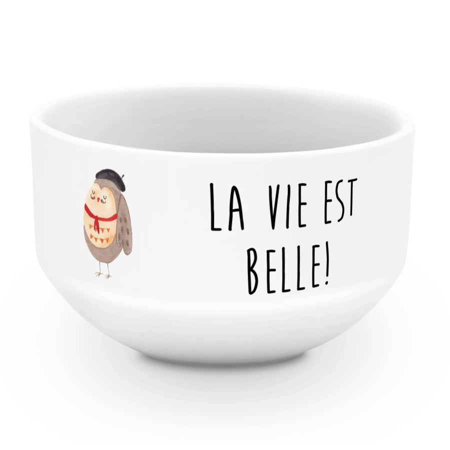 Du liebst gemütliches Frühstück und bezaubernde Deko? Dann ist die Müslischale Eule Französisch von Mr. & Mrs. Panda genau das richtige für dich! Diese wunderschöne Müslischüssel mit dem niedlichen Eulen-Motiv und dem zauberhaften Spruch 'La vie est belle!' versprüht ein Gefühl von Lebensfreude beim ersten Bissen Müsli.