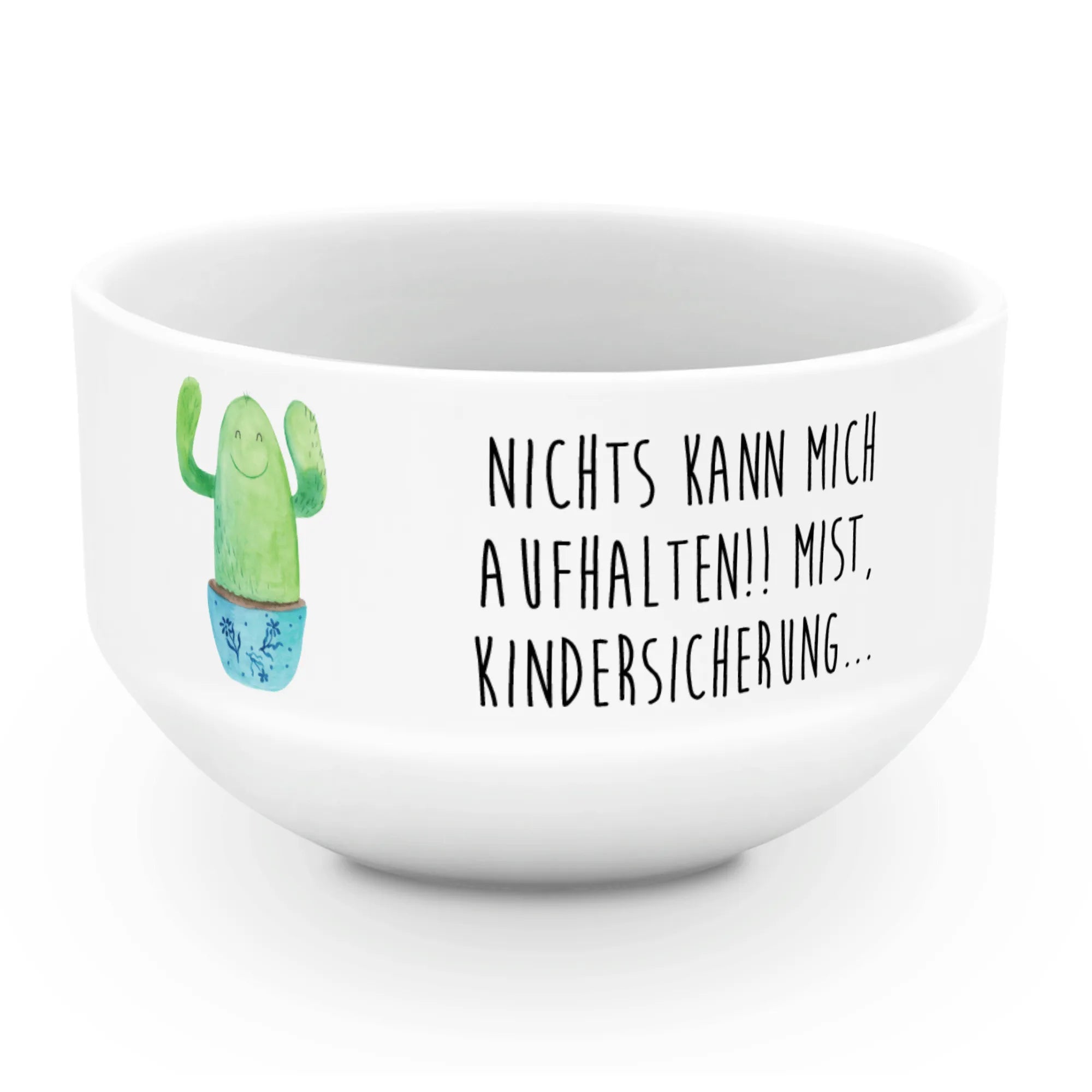Die Müslischale "Kaktus Happy" aus der zauberhaften Kaktus-Kollektion von Mr. & Mrs. Panda ist nicht nur ein praktisches Geschirrstück, sondern ein richtiger Stimmungsaufheller! Mit ihrem fröhlichen Kaktus-Motiv und dem motivierenden Spruch "Nichts kann mich aufhalten!! Mist, Kindersicherung..." bringt sie das sonnige Sommerfeeling direkt zu dir nach Hause oder ins Büro.