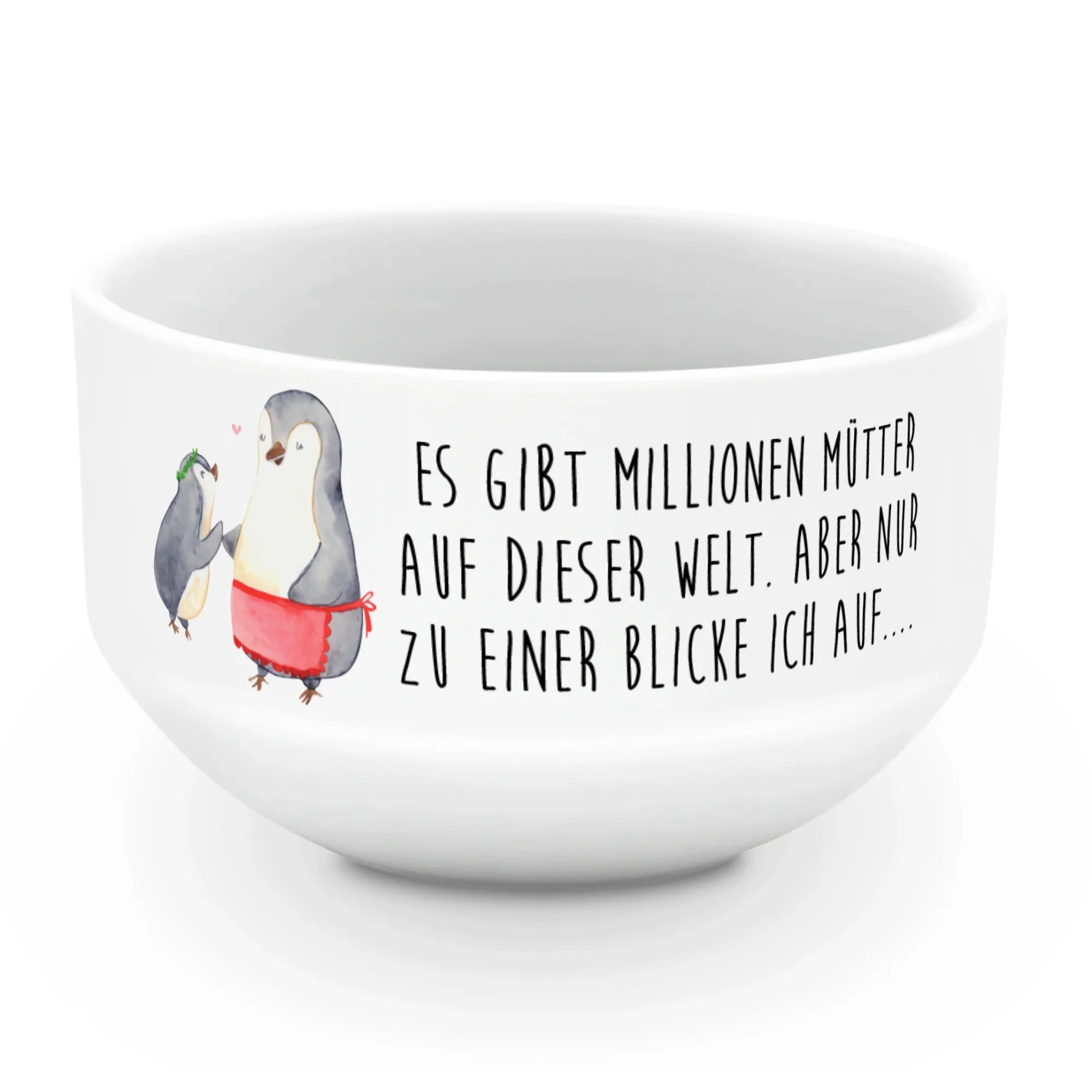 Die Müslischale Pinguin mit Kind aus der liebevollen Familien Kollektion von Mr. & Mrs. Panda ist das perfekte Geschenk für Mamas, die wissen, dass Familie das Wichtigste ist. Diese wunderschöne Müslischüssel aus hochwertigem Porzellan zeigt eine zauberhafte Szene zweier Pinguine: Die Mama-Pinguin in ihrer roten Schürze steht schützend neben ihrem kleinen Pinguin, der stolz mit einem grünen Kranz dekoriert ist. Über ihnen schwebt ein kleines Herz, das die besondere Bindung zwischen Mutter und Kind symbolisiert.