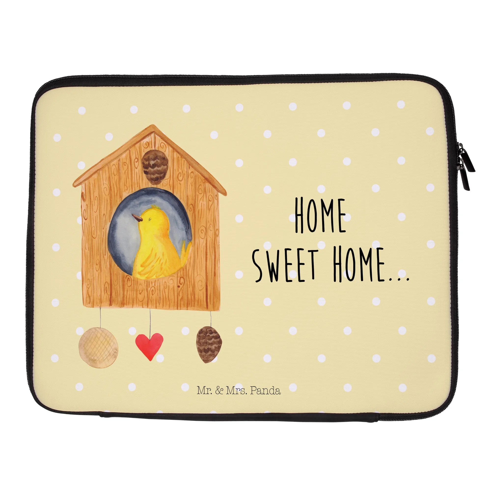 Aus hochwertigem und wasserabweisendem Neopren gefertigt, schützt sie deinen Laptop oder Notebook optimal vor Kratzern, Staub und anderen Schäden, während das süße Motiv eines gelben Vogels in seinem gemütlichen Vogelhaus ein Gefühl von "Home sweet Home..." vermittelt.