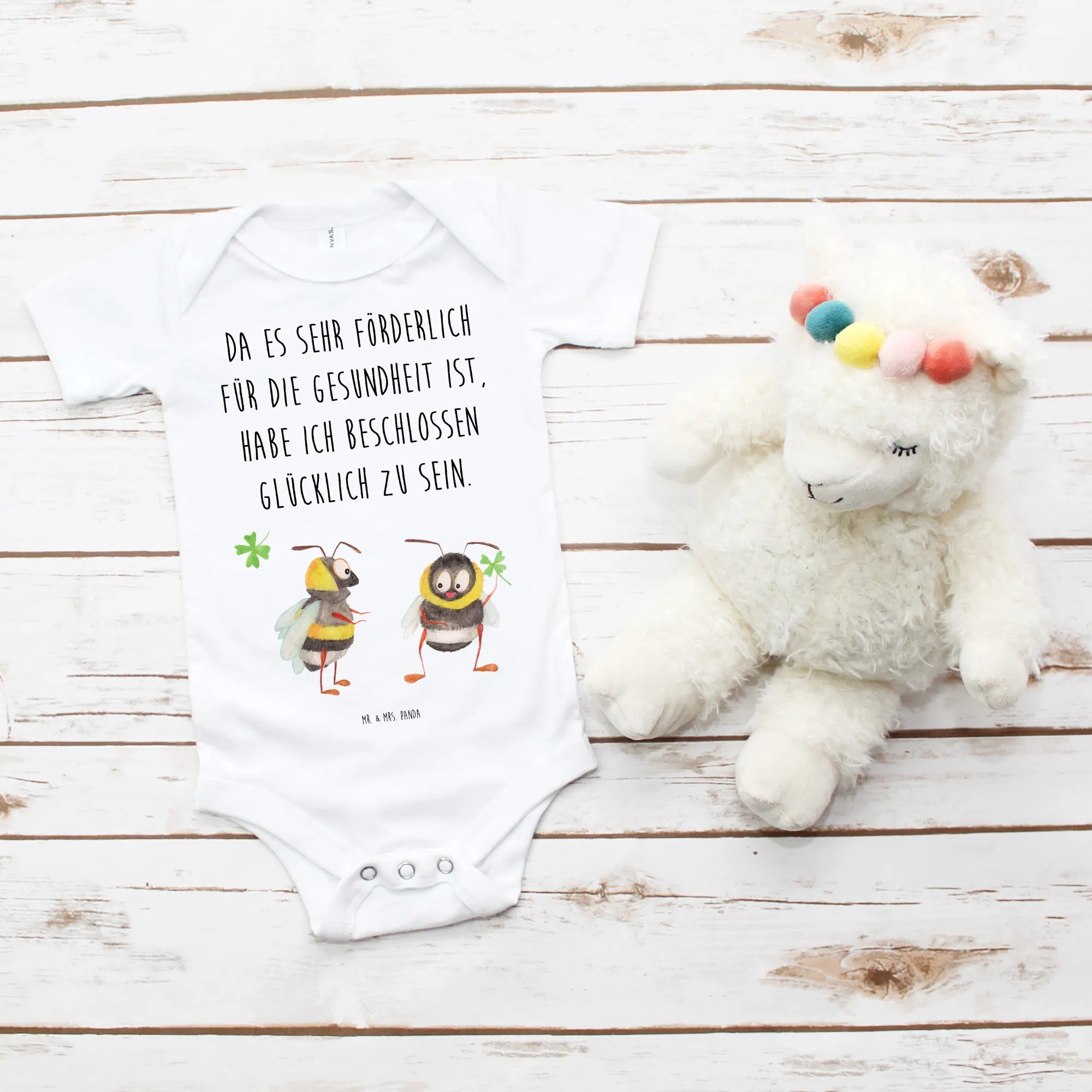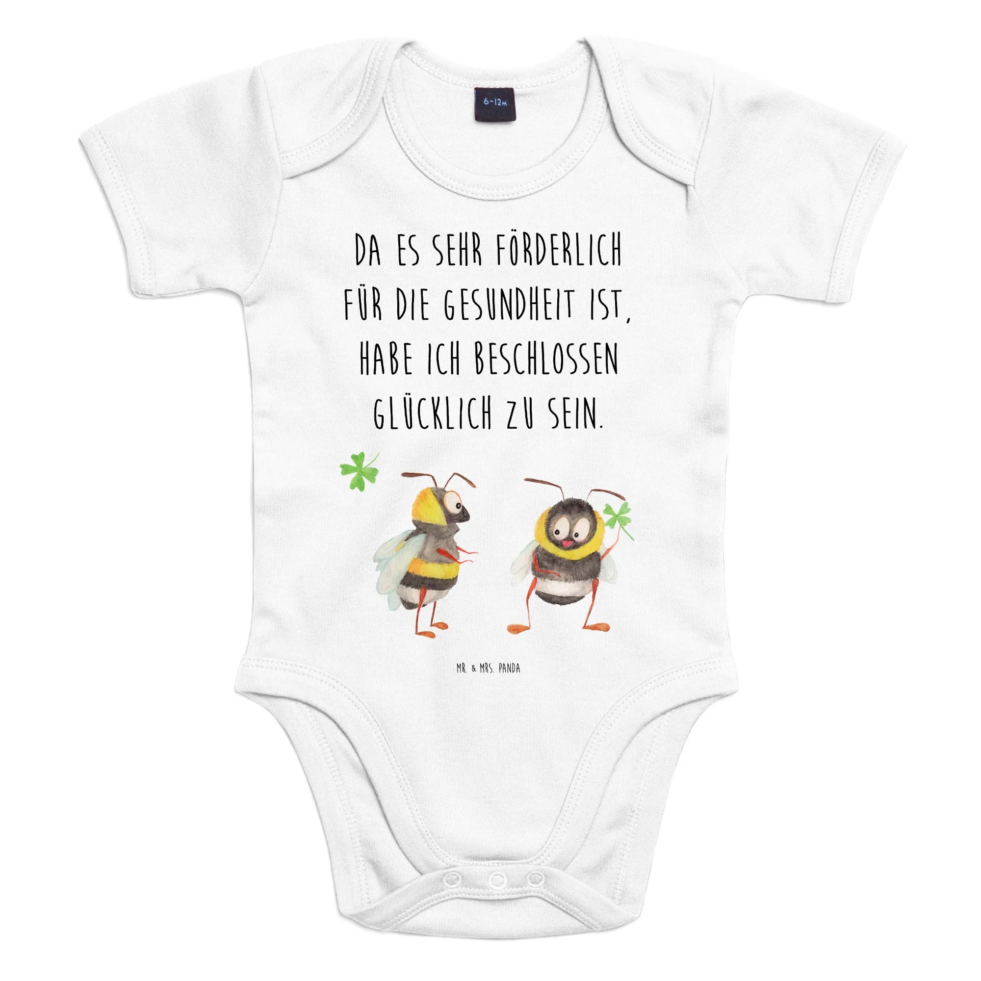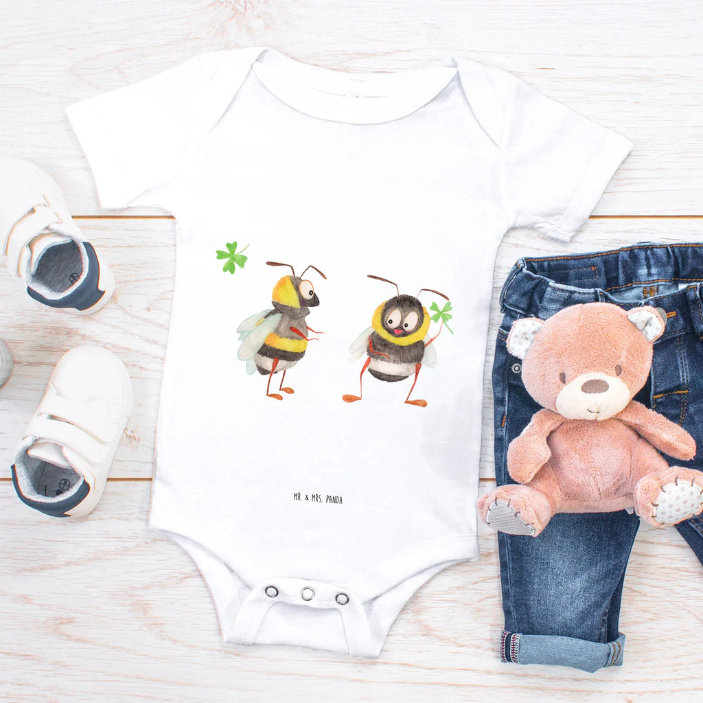 Die zwei niedlichen Hummeln, die sich gegenüberstehen und gemeinsam ein Kleeblatt halten, symbolisieren Freude und Verbundenheit. Es ist, als würde der Body sagen: "Ich bin glücklich, dass du hier bist!".