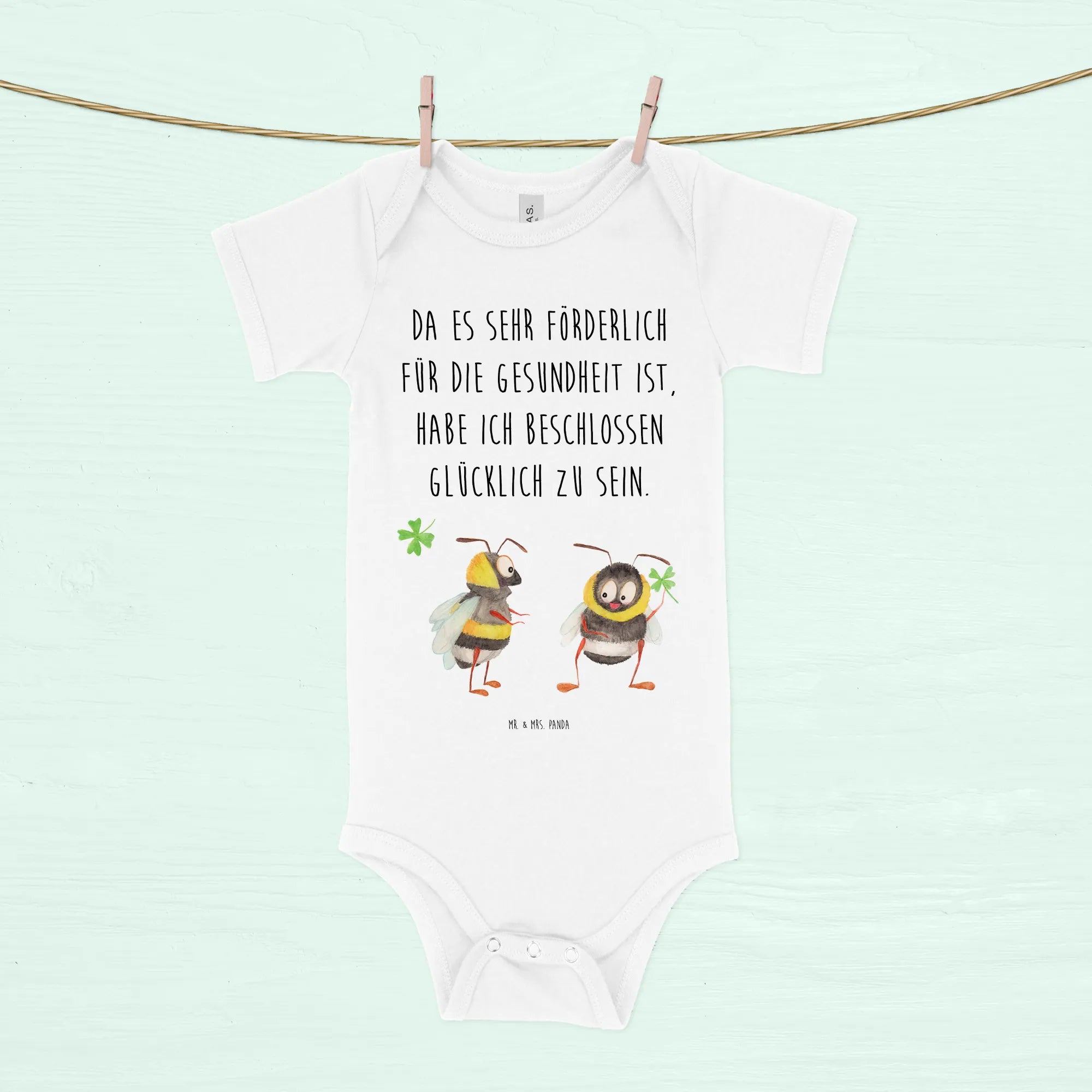 Dieses entzückende Design zeigt zwei niedliche Hummeln, die freudig ein Kleeblatt halten. Der Spruch "Da es sehr förderlich für die Gesundheit ist, habe ich beschlossen, glücklich zu sein" bringt nicht nur gute Laune, sondern auch eine positive Botschaft, die Dein Baby und die Umgebung erfreuen wird.