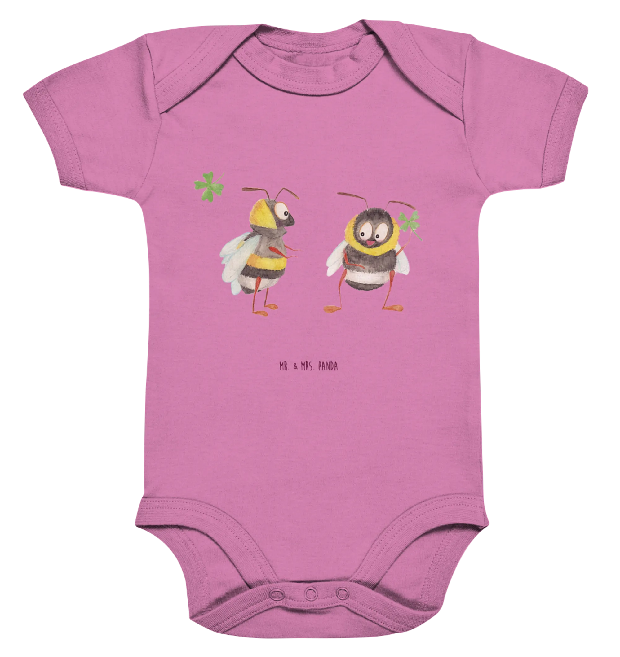 Der Organic Baby Body mit dem bezaubernden Motiv "Hummeln mit Kleeblatt" aus der Kollektion Small World von Mr. & Mrs. Panda ist das perfekte Geschenk für alle frisch gebackenen Eltern! Die süßen Hummeln, die sich gegenüberstehen und ein Kleeblatt halten, stehen für Glück und Verbundenheit – genau das, was du deinem kleinen Lieblingsmenschen vermitteln möchtest.