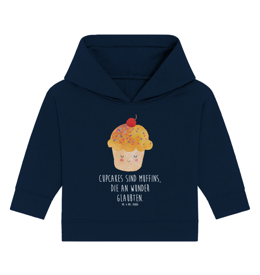 Hergestellt aus hochwertiger, ökologischer Baumwolle, bietet dieses Hoodie ein besonders sanftes Gefühl auf der zarten Babyhaut. Das fröhliche Cupcake-Motiv, welches von Mrs. Panda mit viel Liebe gestaltet wurde, zeigt einen stolzen Cupcake mit bunten Streuseln und einem herzlichen Lächeln. Es ist inspirierend und strahlt Lebensfreude aus, so wie die Botschaft: 'Cupcakes sind Muffins, die an Wunder glaubten.'