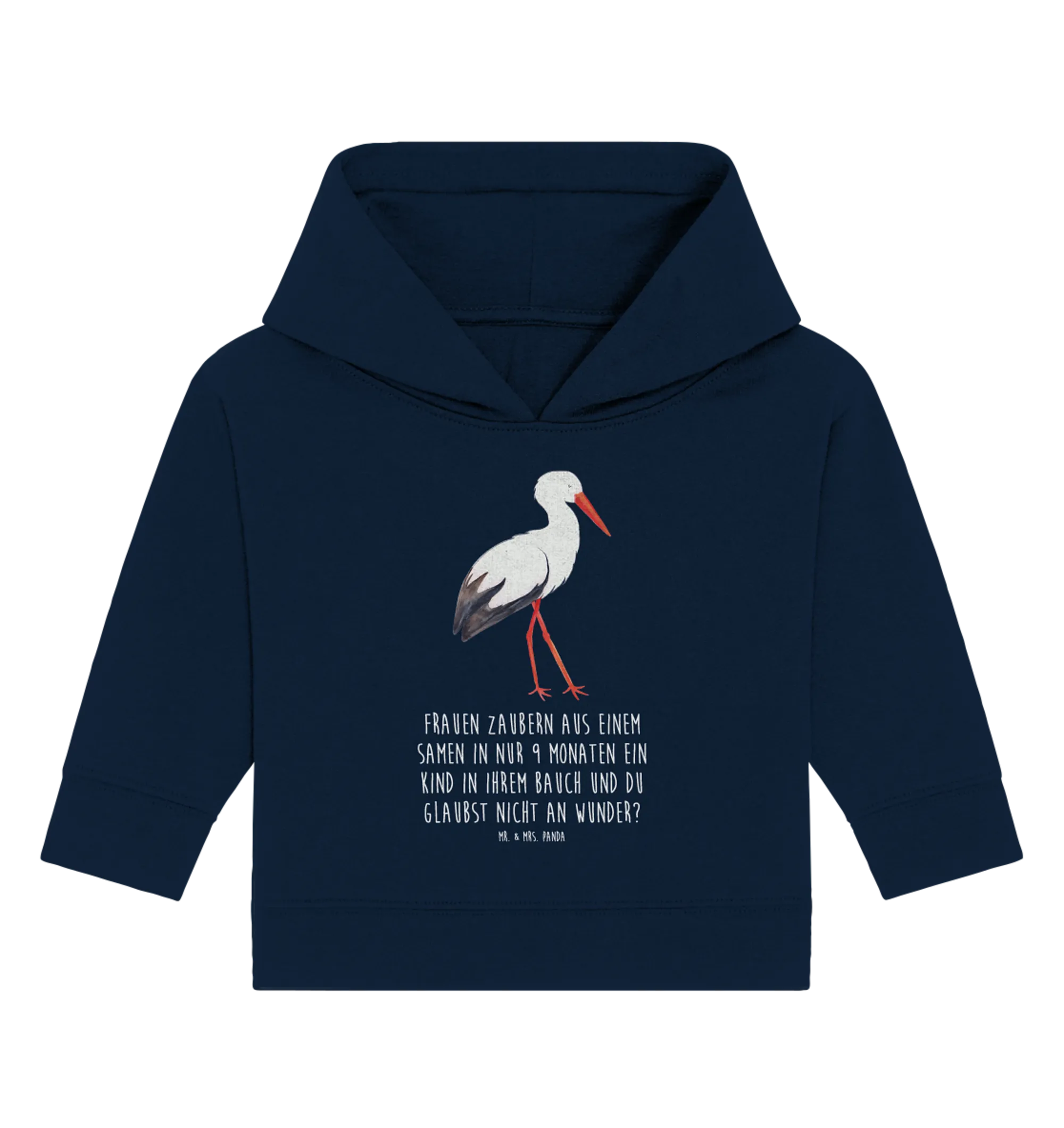 Das stilvolle Design in einem eleganten French Navy sorgt dafür, dass dein kleiner Liebling nicht nur bei besonderen Anlässen, sondern auch im Alltag glänzen kann. Das besondere Augenmerk liegt auf dem Motiv - ein süßer Storch, der ein Baby in einem Tuch trägt, begleitet von dem herzlichen Spruch: 'Frauen zaubern aus einem Samen in nur 9 Monaten ein Kind in ihrem Bauch und du glaubst nicht an Wunder?'. Dieser Hoodie ist nicht nur ein modisches Statement, sondern auch eine Hommage an die unglaubliche Reise der Schwangerschaft.