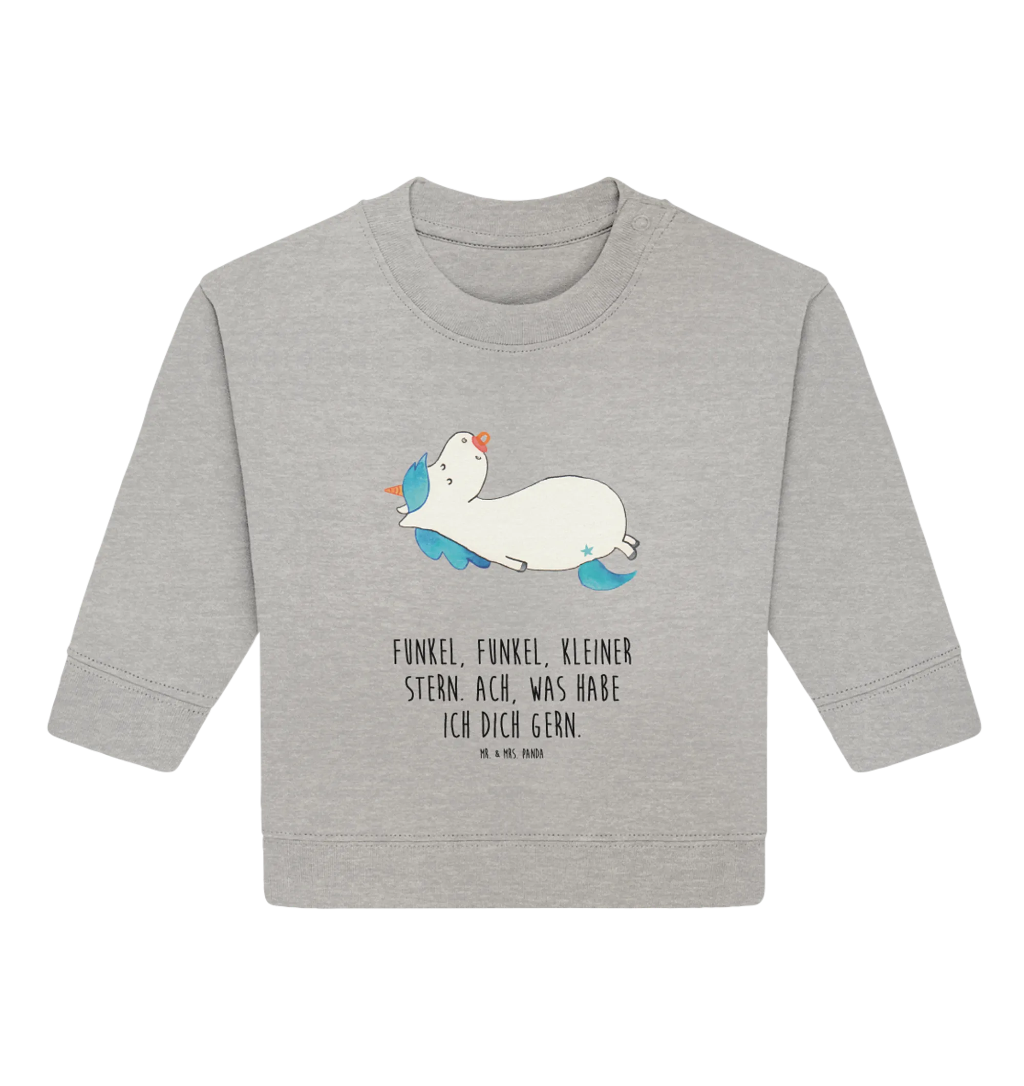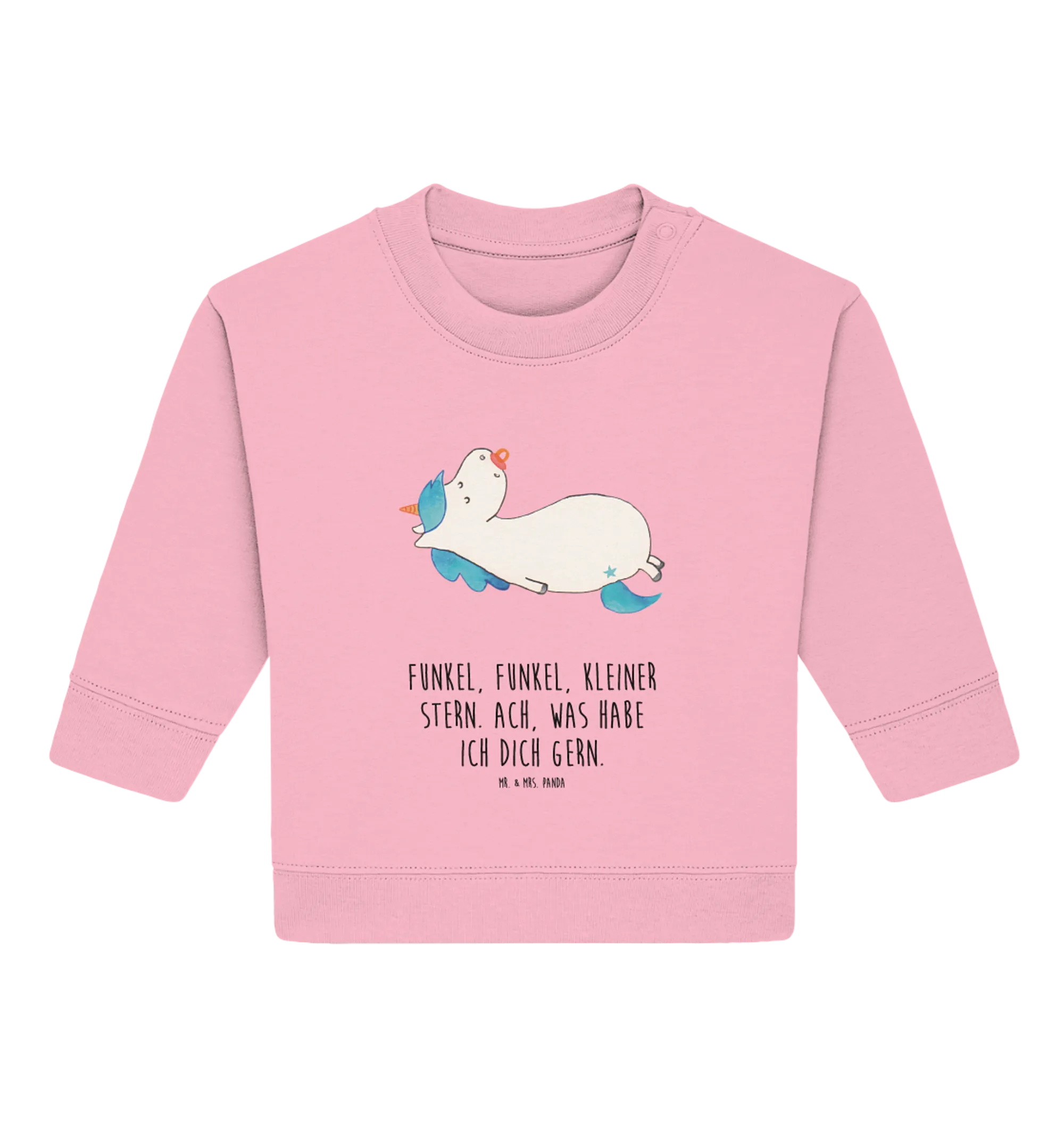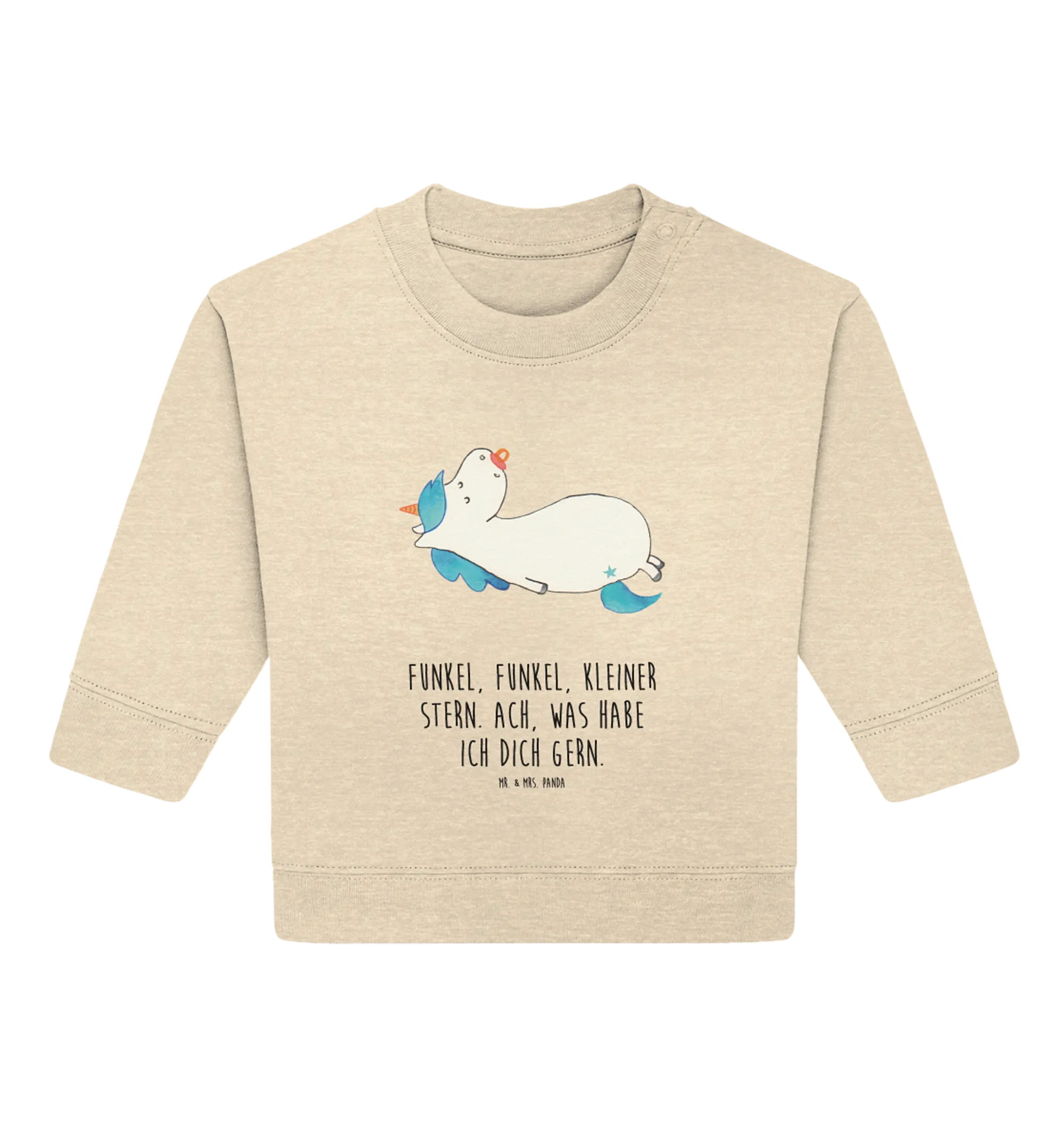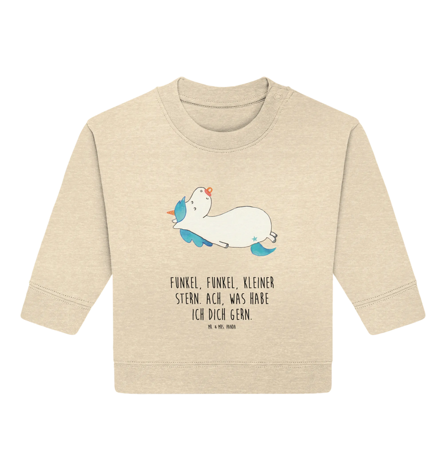 Der Organic Baby Pullover "Einhorn Schnullie" aus der Einhorn-Kollektion von Mr. & Mrs. Panda ist das perfekte Geschenk für kleine Einhorn-Fans und ihre glücklichen Eltern. Hergestellt aus weicher, hochwertiger Öko-Baumwolle, ist dieser Pullover nicht nur besonders niedlich, sondern auch angenehm für die zarte Babyhaut. Mit seinem zauberhaften Einhorn-Motiv, das ein schlafendes Baby mit einem Schnuller darstellt, wird er zum Lieblingsstück deines Kleinen. Ideal für die ersten Lebensmonate von Säuglingen und Kleinkindern bis zum Alter von 18 Monaten!