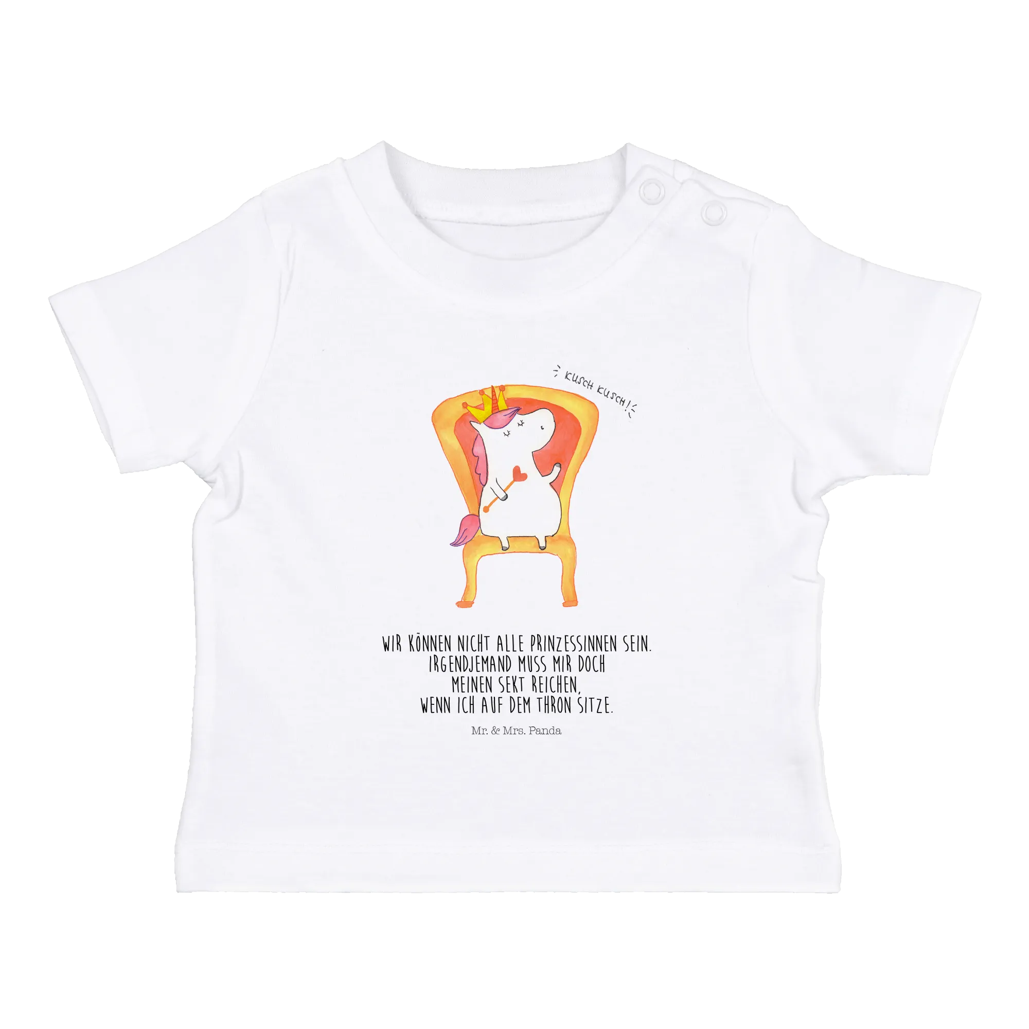Geboren aus der kreativen Feder von Mrs. Panda, besticht das Design mit einem niedlichen Einhorn, das voller Anmut auf einem Thron sitzt und seine glitzernde Krone stolz trägt. Die Kombination aus unendlicher Fantasie und einem Hauch von Prinzessinnen-Zauber macht dieses Shirt zu einem besonderen Kleidungsstück, das jedes Baby strahlen lässt.