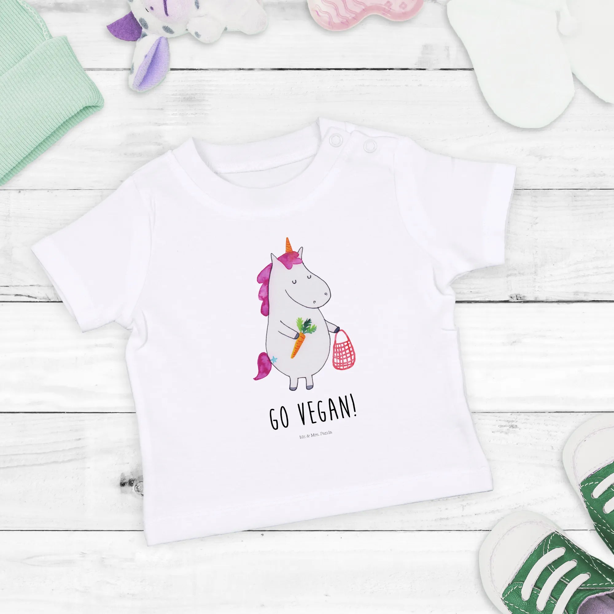Das wunderbare Einhorn T-Shirt von Mr. & Mrs. Panda ist das perfekte Geschenk für kleine Trendsetter, die bereits ab den ersten Lebensmonaten einen unverwechselbaren Stil zum Ausdruck bringen wollen. Aus 100% Bio-Baumwolle gefertigt, ist dieses Baby T-Shirt nicht nur unglaublich weich und bequem, sondern auch umweltfreundlich. Die süße Illustration eines Einhorns, das mit seiner Einkaufstasche vegane Lebensmittel kauft, ist ein echter Hingucker! Es spiegelt den modernen Lebensstil wider, in dem gesunde Ernährung, Veganismus und nachhaltige Lebensweise großgeschrieben werden.