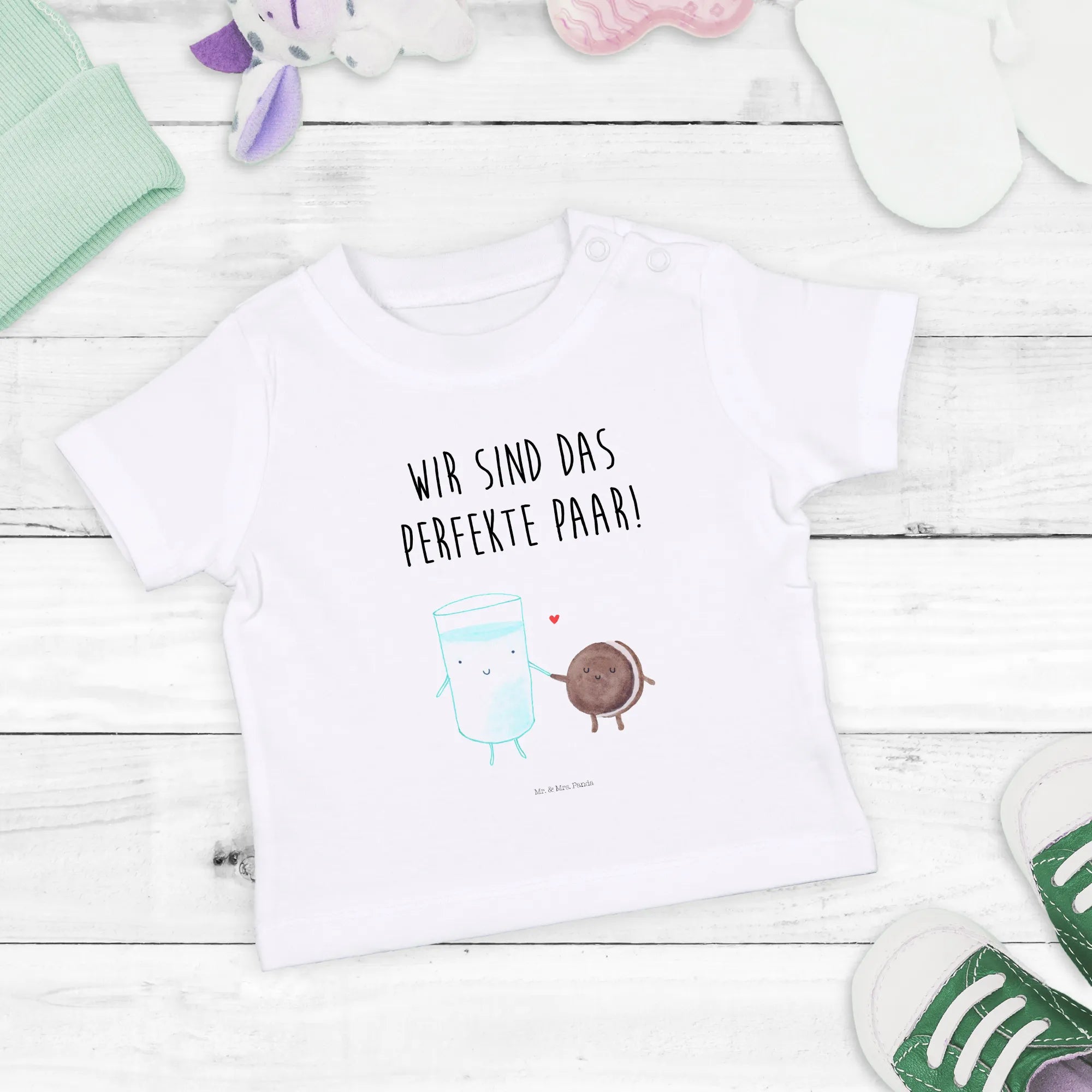Das Organic Baby Shirt "Milch & Keks" von Mr. & Mrs. Panda ist das perfekte Geschenk für alle frisch gebackenen Eltern, die ihren kleinen Liebling begeistert kleiden möchten.