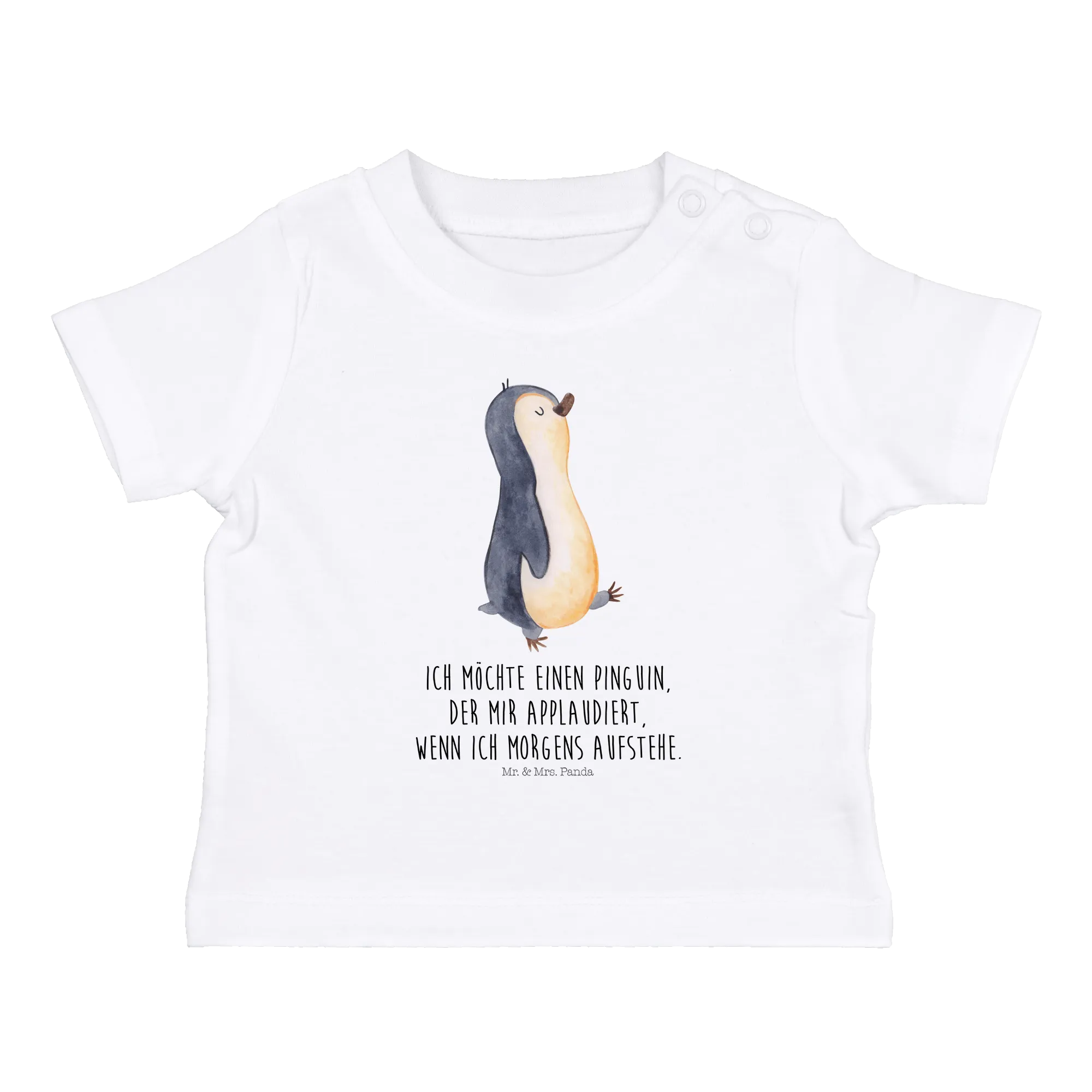 Das tolle Design eines marschierenden Pinguins sorgt dafür, dass jeder Tag mit einem Lächeln beginnt. Die Botschaft auf dem Shirt – 'Ich möchte einen Pinguin, der mir applaudiert, wenn ich morgens aufstehe.' – ist perfekt für Frühaufsteher und Langschläfer gleichermaßen. Ob zum ersten Geburtstag, zur Taufe oder einfach als liebevolles Mitbringsel, dieses Shirt ist ein Hit!