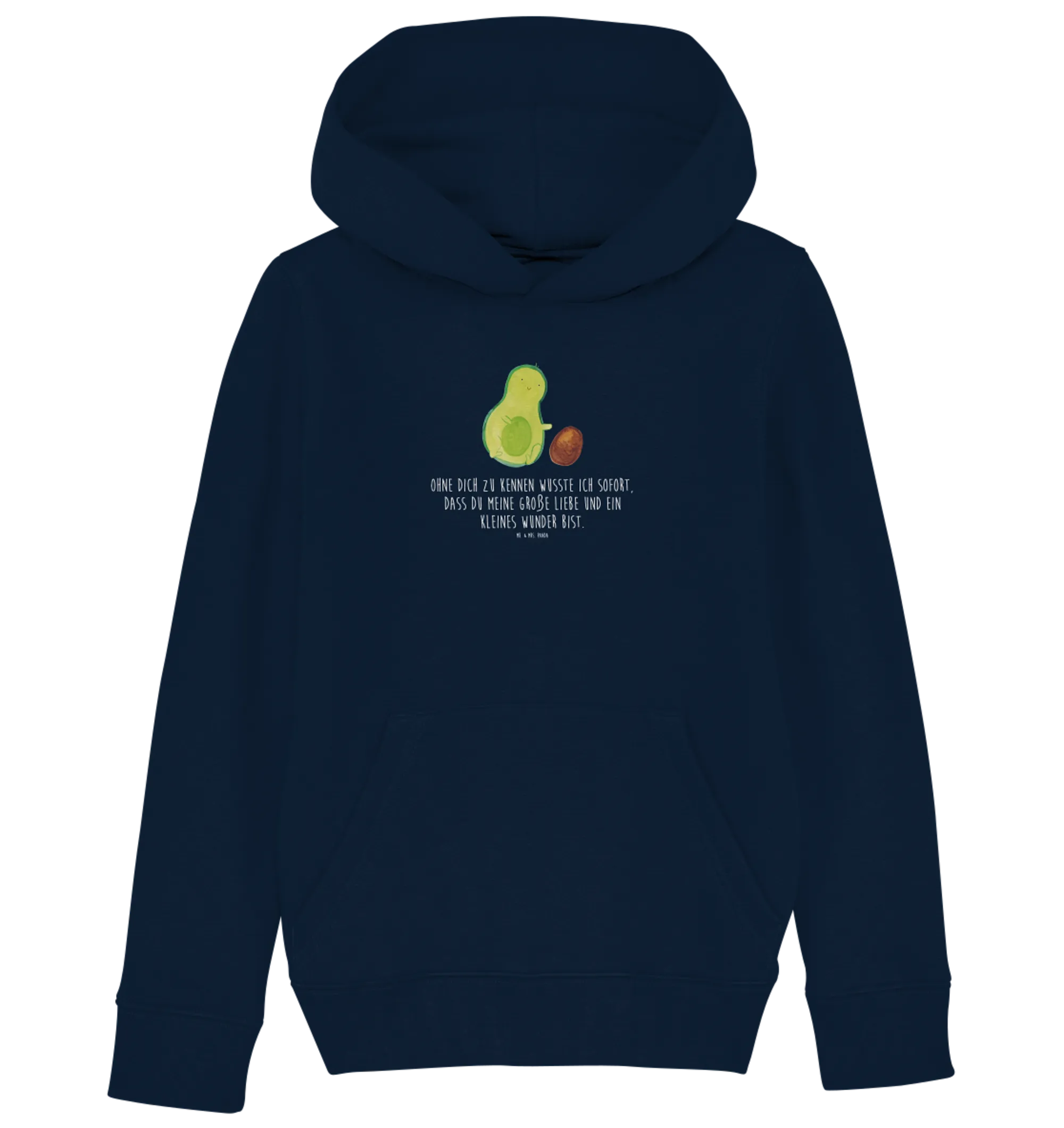 Die Avocado ist nicht nur wichtig für eine gesunde Ernährung, sondern symbolisiert auch Liebe und Zuneigung. Bei der Präsentation des Textes - "Ohne dich zu kennen wusste ich sofort, dass du meine große Liebe und ein kleines Wunder bist." - wird deutlich, wie besonders der Hoodie ist und wie viel Bedeutung er für Eltern und Kinder hat.