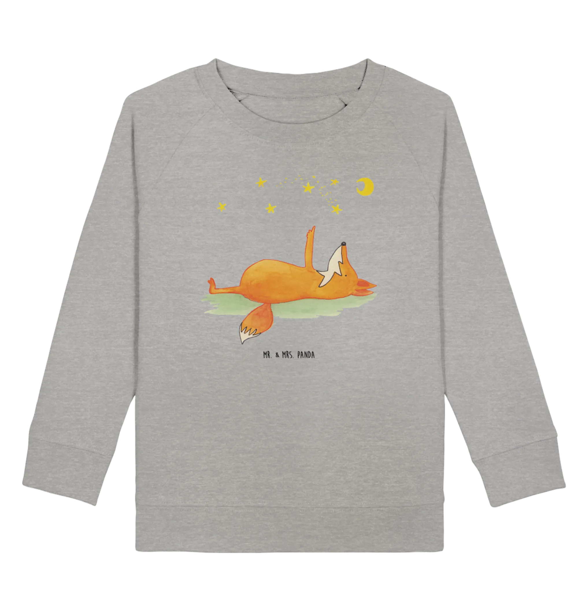 Der Organic Kinder Pullover mit dem süßen Motiv "Fuchs Sterne" aus der Fuchs Kollektion von Mr. & Mrs. Panda ist das perfekte Geschenk für kleine Träumer und Sternengucker. Er zeigt einen entzückenden Fuchs, der gemütlich auf seinem Rücken liegt und fasziniert in den nächtlichen Sternenhimmel schaut.