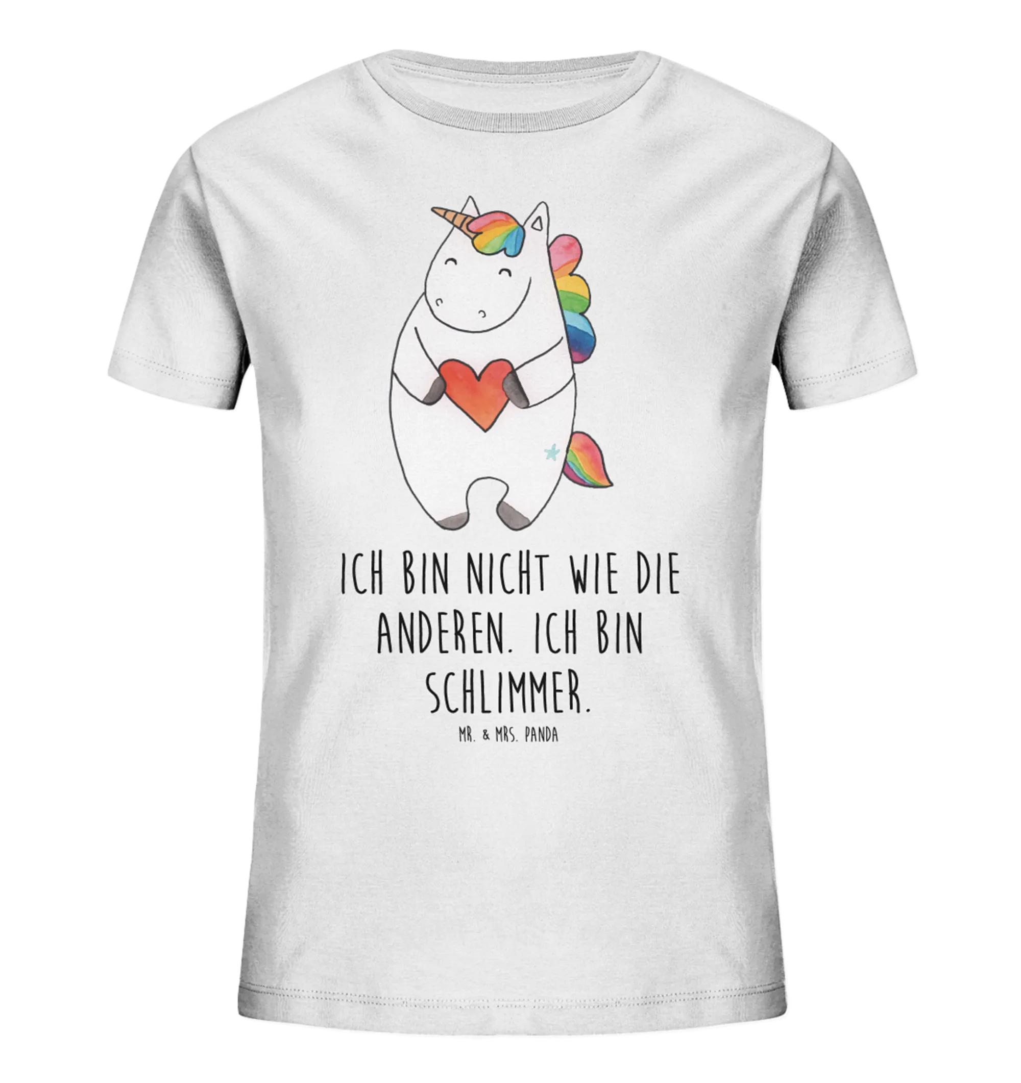 Mit einem modernen Rundhalsausschnitt und in den Größen 3-4 bis 12-14 Jahre erhältlich, passt es sich ideal dem Wachstum Deines Kindes an. Das lustige Motiv zeigt ein freundliches Einhorn, das ein Herz in der Hand hält, und die witzige Botschaft "Ich bin nicht wie die Anderen. Ich bin schlimmer!" bringt jeden zum Schmunzeln.
