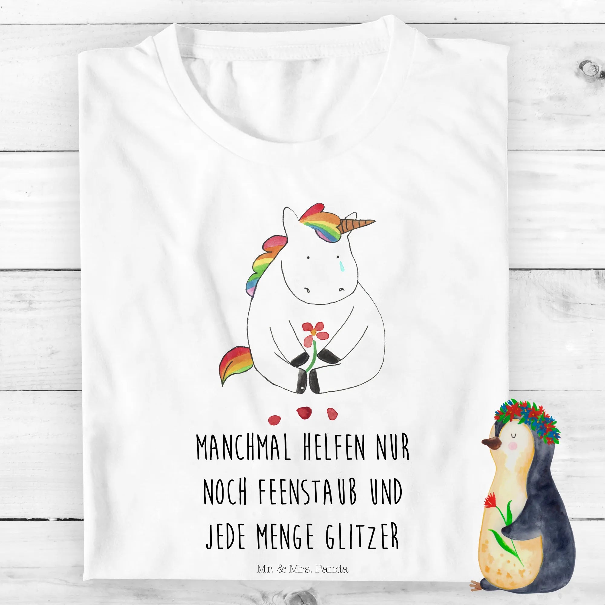 Die Einhorn Kollektion von Mr. & Mrs. Panda beinhaltet liebevoll handgezeichnete Motive, die mit lebensfrohen Sprüchen das Herz erwärmen. Wenn du nach einem besonderen Geschenk suchst, das zaubert und Trost spendet – dann ist dieses T-Shirt genau das Richtige!