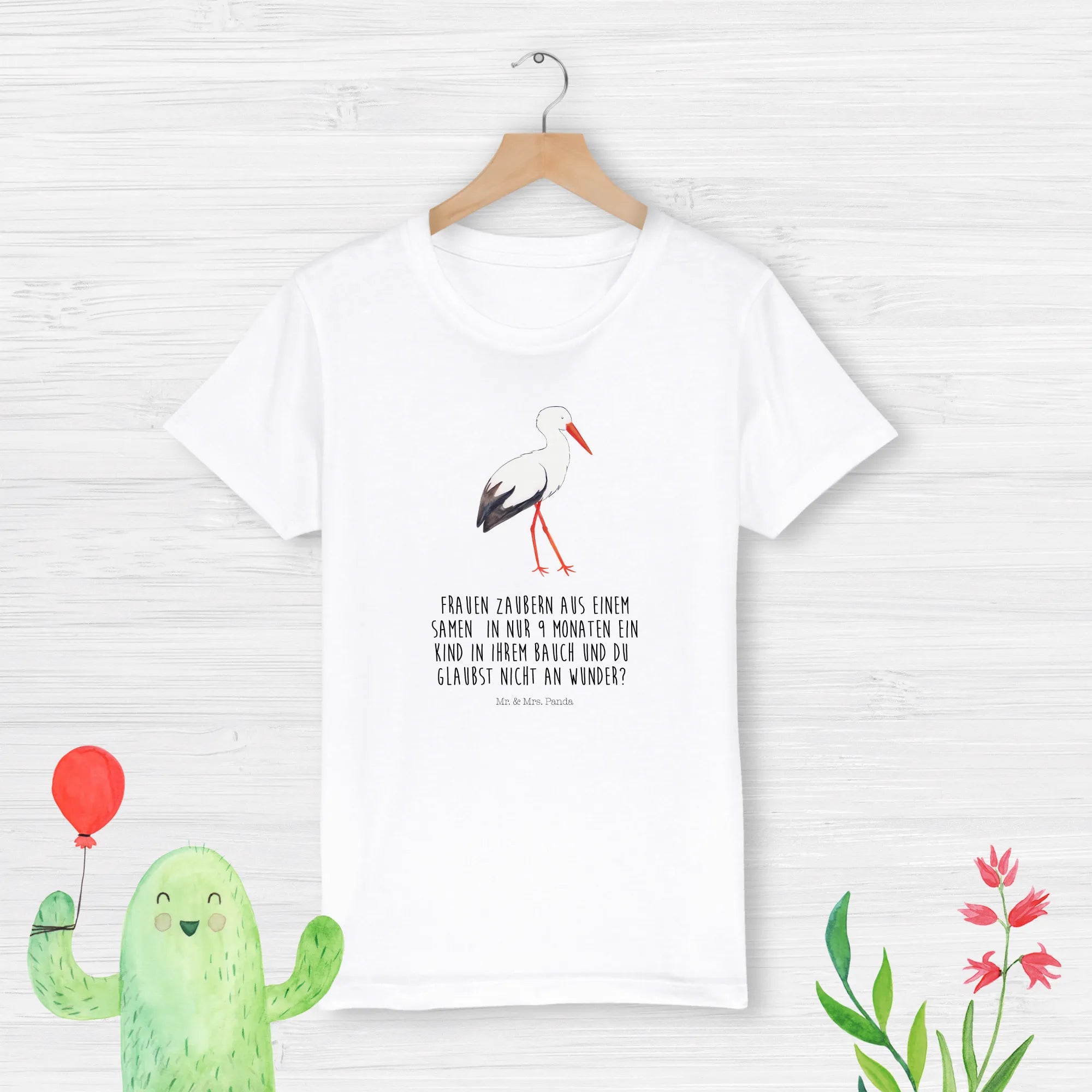 Der süße Storch trägt ein kleines Baby in seinem Tuch und lässt die Herzen von Müttern und Vätern höher schlagen. Dieses T-Shirt ist ein ganz besonderes Geschenk zur Schwangerschaft, zur Geburt oder auch einfach als Freude für das eigene Kind. Die liebevolle Botschaft „Frauen zaubern aus einem Samen in nur 9 Monaten ein Kind in ihrem Bauch und du glaubst nicht an Wunder?“ bringt ein Lächeln auf die Gesichter aller, die vom Wunder des Lebens begeistert sind.