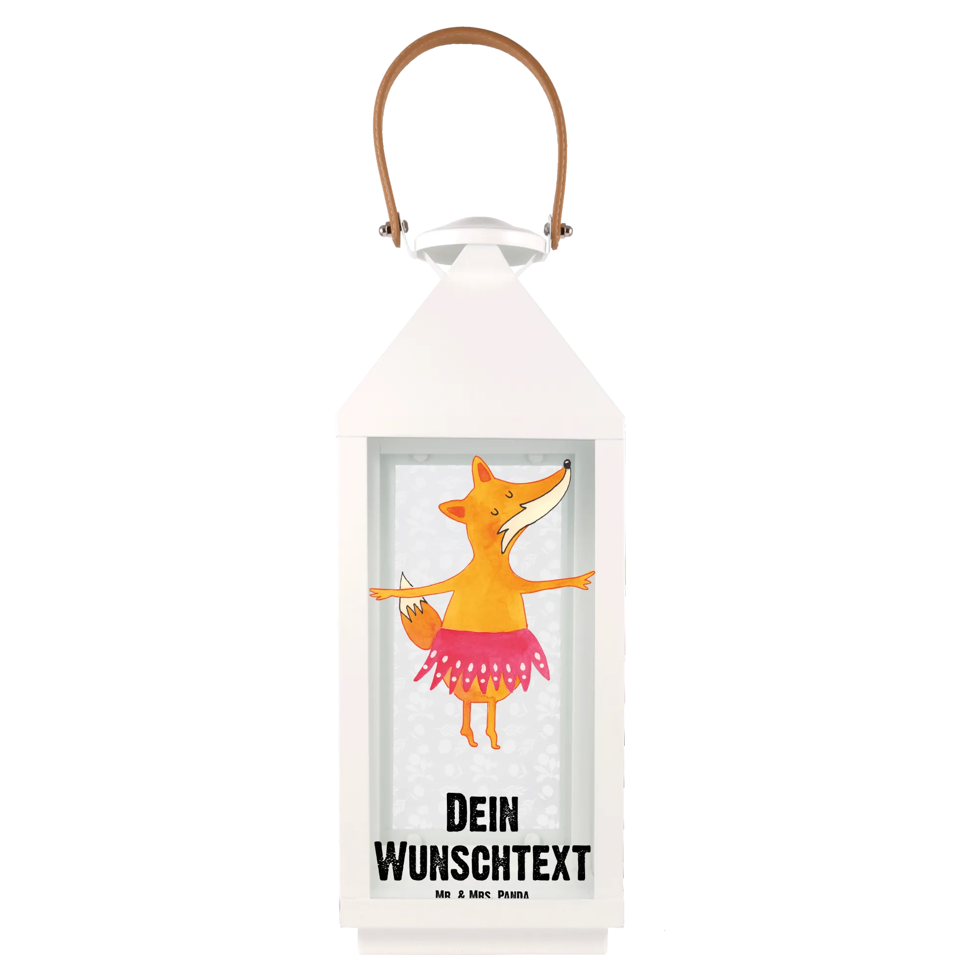 Die Laterne ist aus hochwertigem, weiß lackiertem Metall gefertigt und bietet Platz für Kerzen oder Lichterketten, wodurch sie sowohl drinnen als auch draußen eine gemütliche Atmosphäre schafft. Das süße Fuchs Ballerina-Motiv, das von der talentierten Mrs. Panda handgezeichnet wurde, vermittelt Freude und einen Sinn für Freiheit.