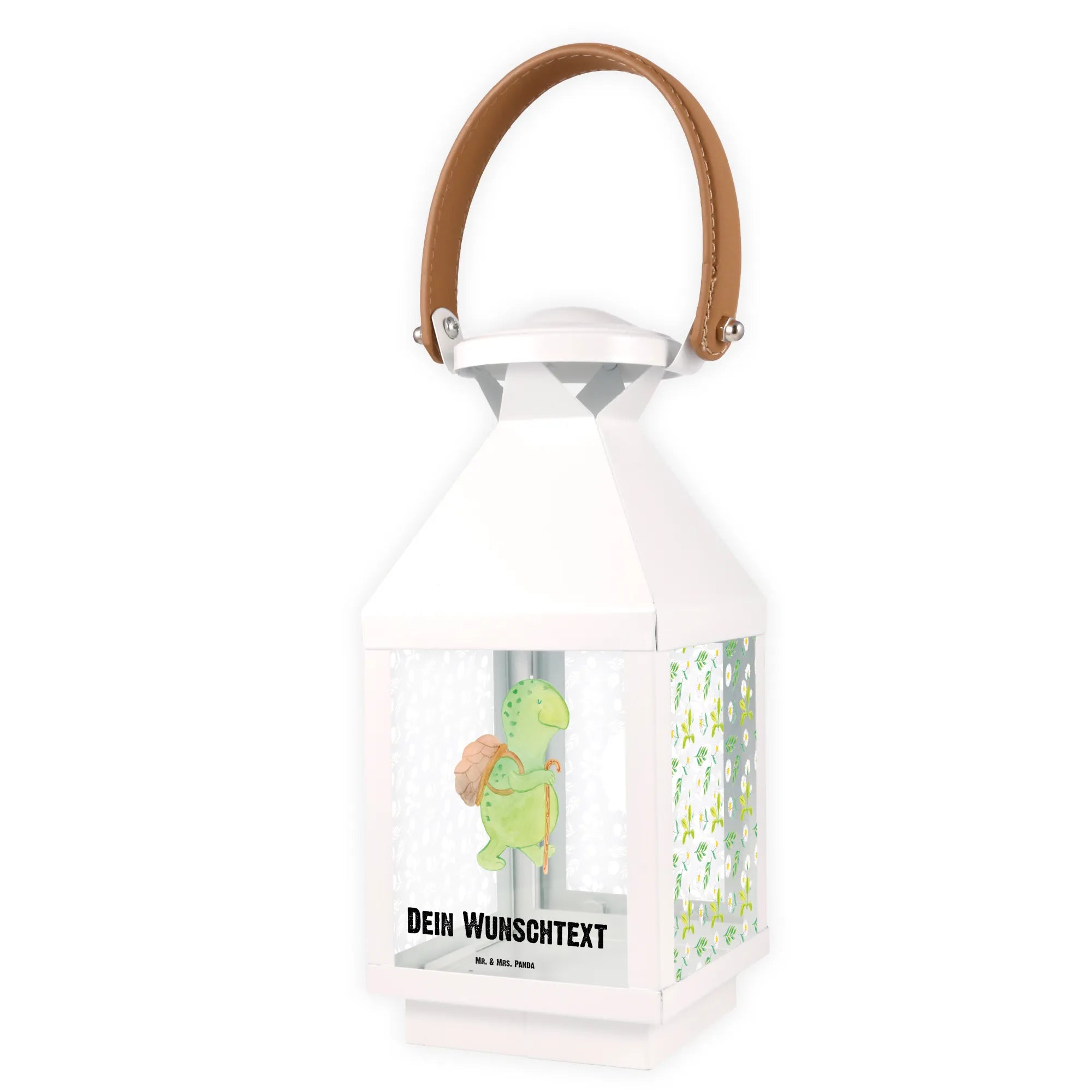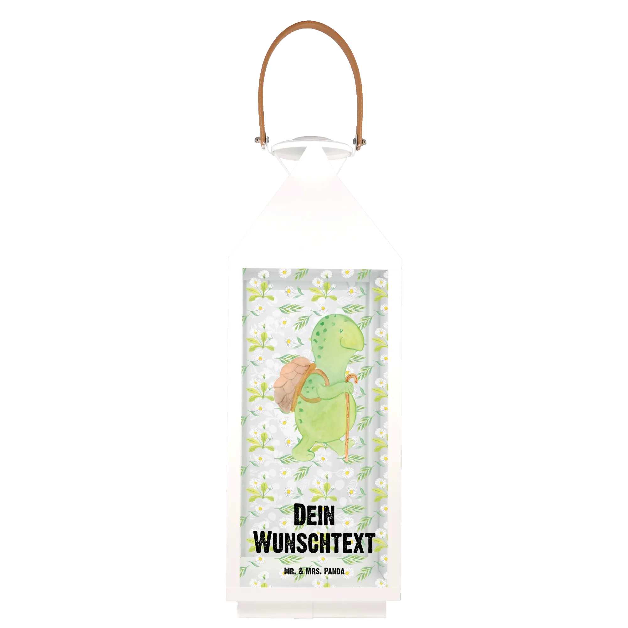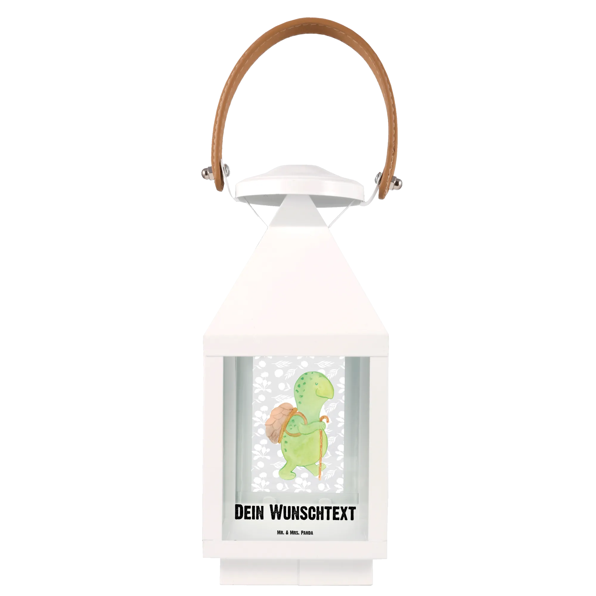 Die personalisierte Deko Laterne mit dem süßen Motiv der Schildkröte Wanderer von Mr. & Mrs. Panda ist das perfekte Geschenk für jeden Naturliebhaber und Schildkröten-Fan.