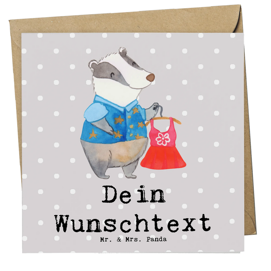 Die hochwertige Karton-Optik sorgt dafür, dass die Karte nicht nur schön aussieht, sondern auch eine angenehme Haptik hat. Auf der Vorderseite der Karte wird das süße Motiv eines Dachs präsentiert, der im trendigen Outfit ein schickes Kleid präsentiert, ergänzt durch den lustigen Spruch: "Du bist nur ein halber Mensch, wenn du keine Modeverkäuferin bist." Dies bringt sowohl Charme als auch einen Hauch von Humor in jede Geschenkidee.