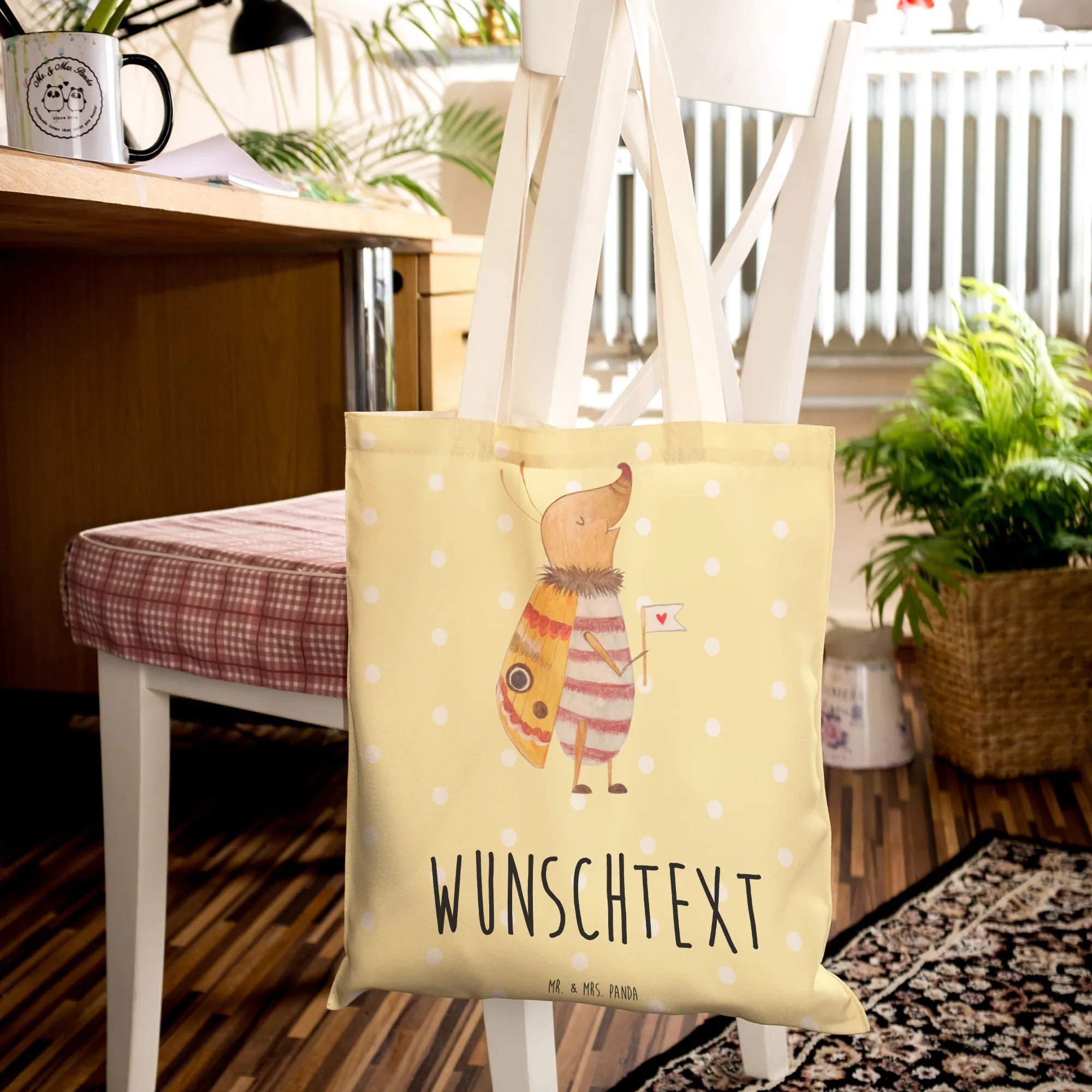 Die personalisierte Einkaufstasche mit dem süßen Motiv "Nachtfalter mit Fähnchen" aus der Kollektion Small World von Mr. & Mrs. Panda ist das perfekte Geschenk für alle, die das Besondere lieben.