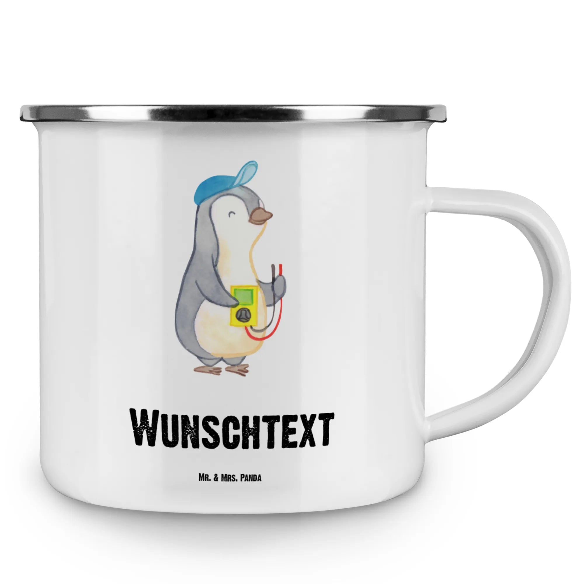 Die personalisierte Emaille Tasse "Elektriker mit Herz" von Mr. & Mrs. Panda ist das perfekte Geschenk für jeden Elektriker oder Elektrotechniker in deinem Leben! Mit einem niedlichen Motiv, das unseren kleinen Pinguin zeigt, der mit Hochspannung arbeitet und tüftelt, zaubert diese Tasse jedem ein Lächeln ins Gesicht.
