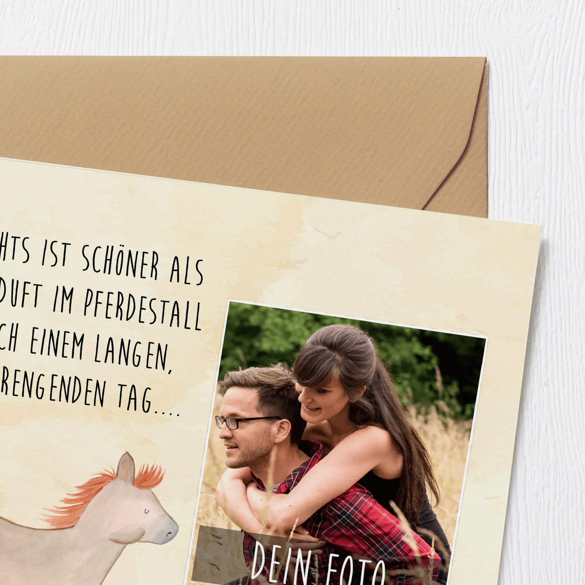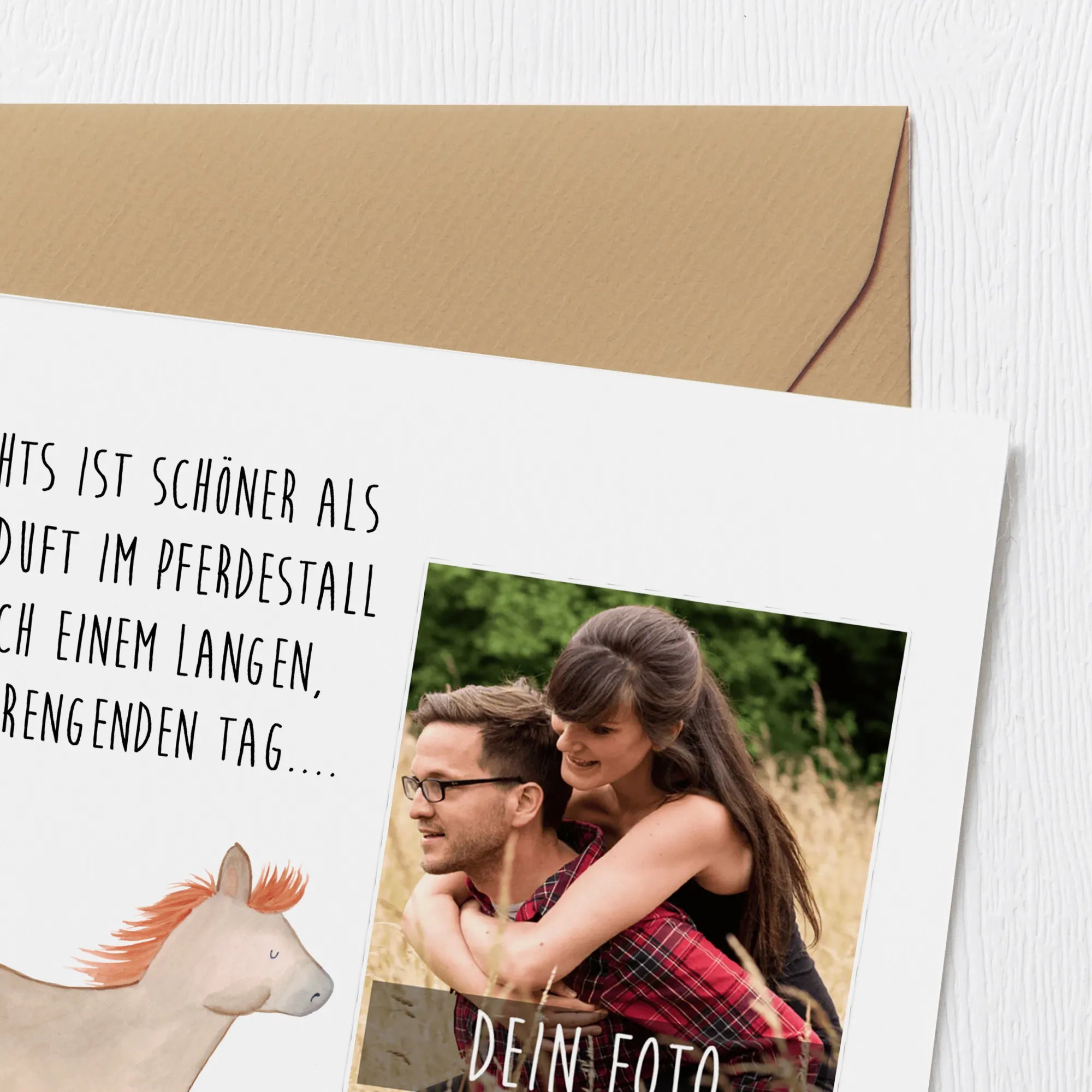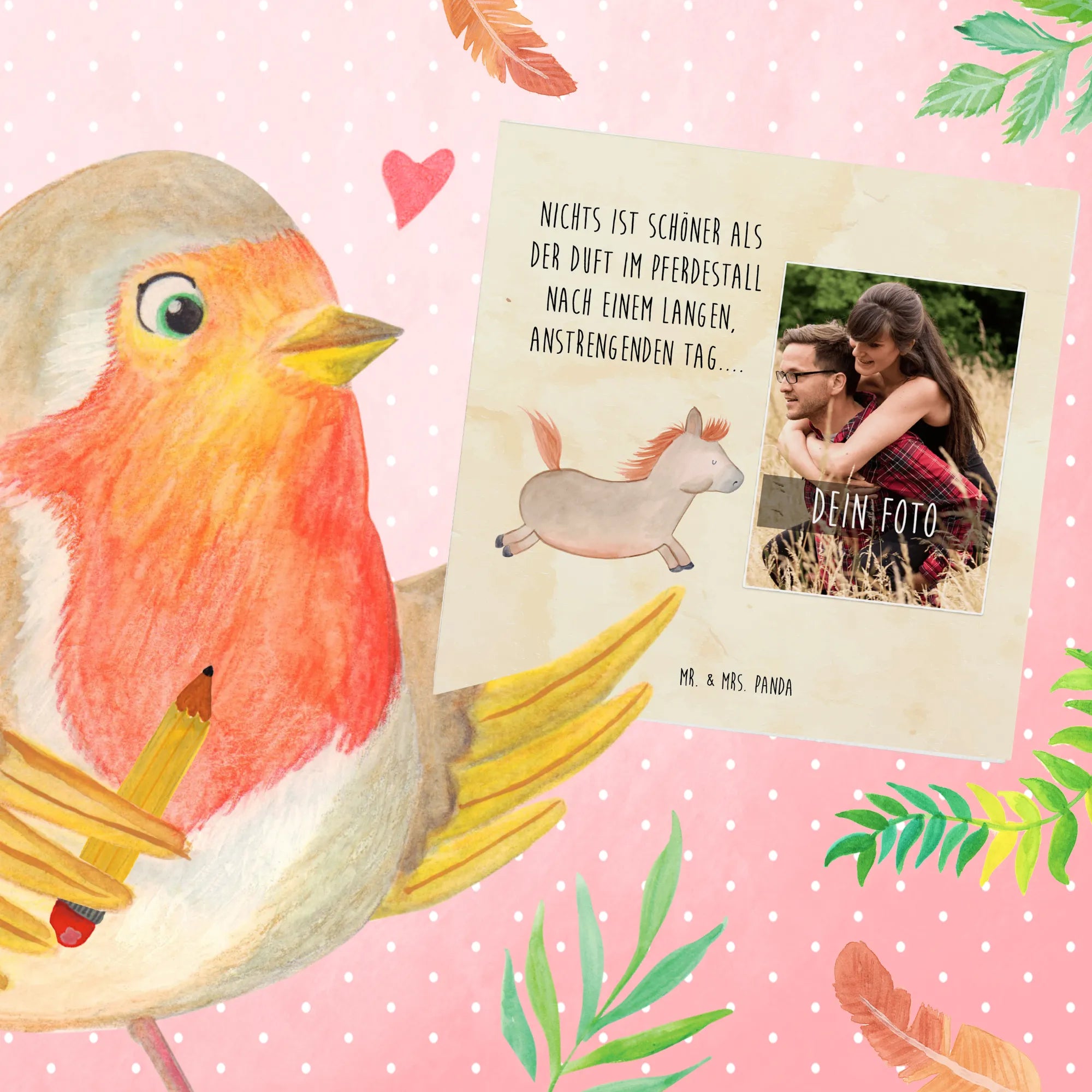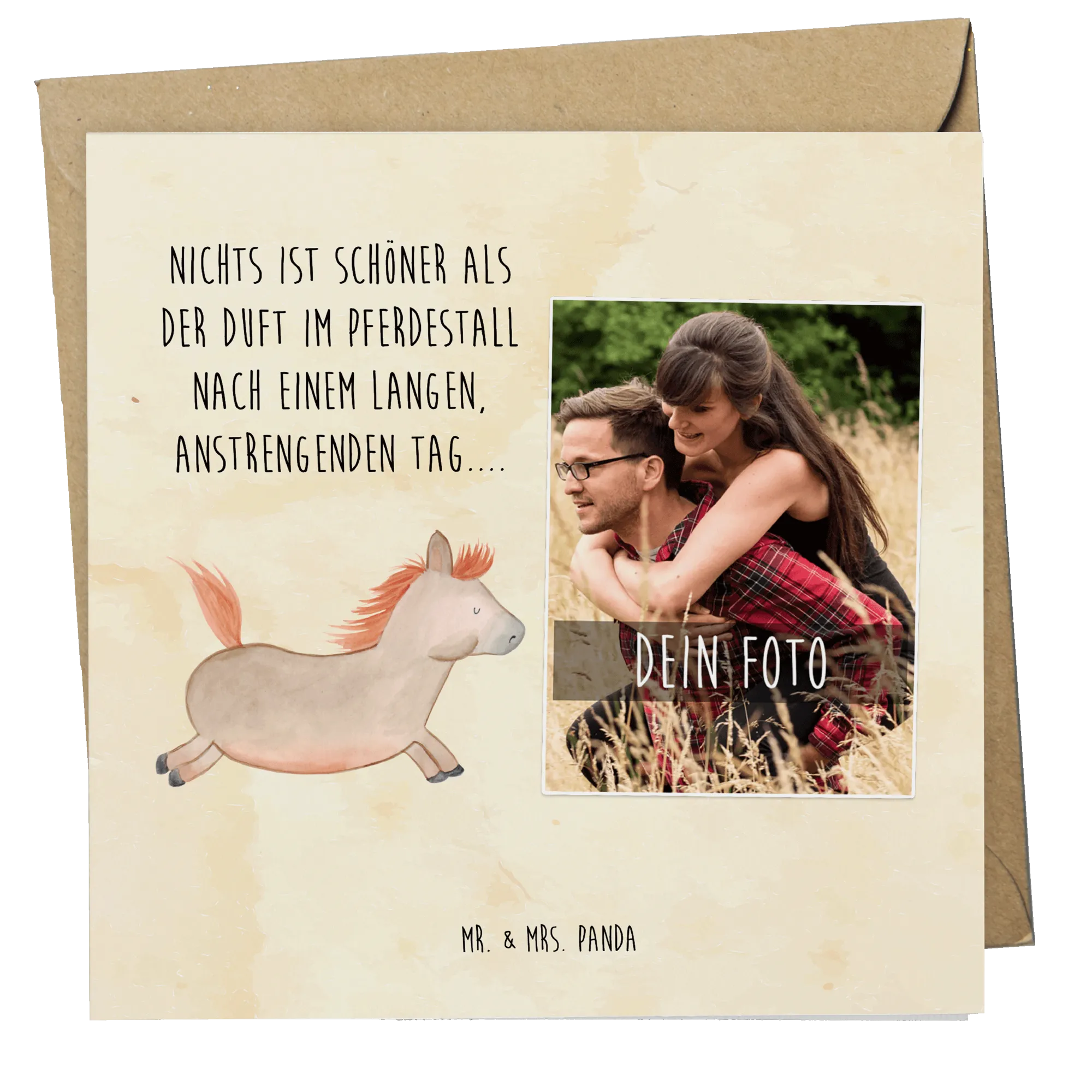 Mit einem niedlichen, fröhlich springenden Pferd, das von der Hand von Mrs. Panda liebevoll gestaltet wurde, versprüht sie gute Laune und Lebensfreude. Nur die besten Erinnerungen sind wert, festgehalten zu werden und was eignet sich besser, als dies mit einem persönlichen Foto zu tun? Die Karte kann individuell mit deinem Wunschnamen oder Wunschtext gestaltet werden. Diese besondere Note macht sie einzigartig und persönlich, sodass sie direkt ins Herz trifft.