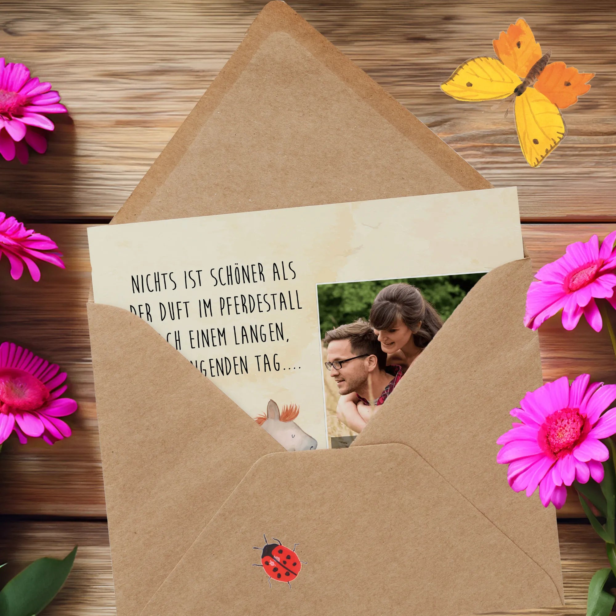 Mit einer Größe von 140 mm x 140 mm und aus hochwertigem 300 Gramm Karton bietet die Karte eine edle Optik, die beeindruckt. Die matte Innenseite ermöglicht dir, deine ganz persönlichen Grüße zu hinterlassen – ganz gleich, ob freundlich, witzig oder herzlich – deiner Kreativität sind keine Grenzen gesetzt! Der Slogan 'Nichts ist schöner als der Duft im Pferdestall nach einem langen, anstrengenden Tag...' rundet das schöne Design ab und lässt jeden Pferdeliebhaber sofort nicken und schmunzeln.