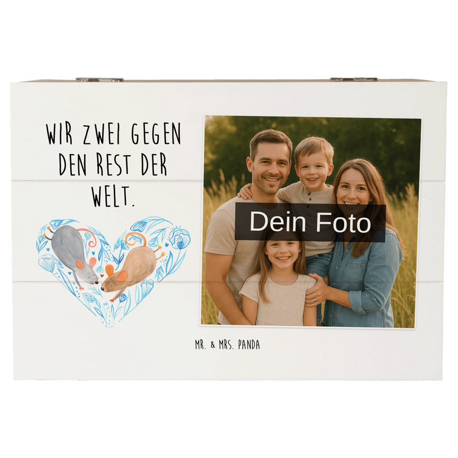 Die personalisierte Foto Holzkiste Mäuse Herz von Mr. & Mrs. Panda ist der perfekte Liebesbeweis für all jene, die ihre Erinnerungen in etwas besonders Einzigartiges verwandeln möchten. Mit einem zauberhaften Motiv von zwei niedlichen Mäusen, die zusammen ein Herz bilden, überbringt diese Kiste eine liebevolle Botschaft: 'Wir zwei gegen den Rest der Welt.' Sie ist nicht nur ein wunderschöner Aufbewahrungsort für Fotos und persönliche Schätze, sondern auch ein emotionales Geschenk, das unvergessliche Momente festhält.
