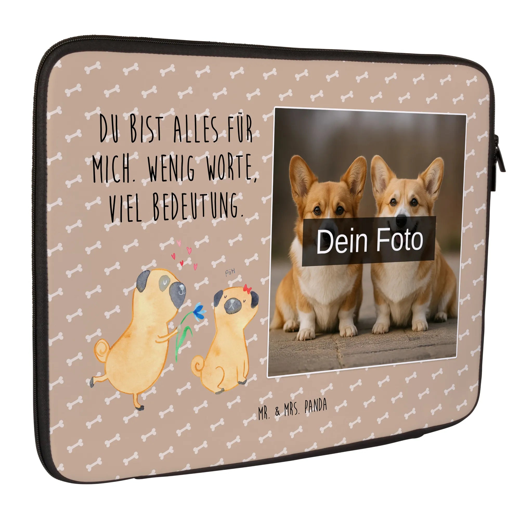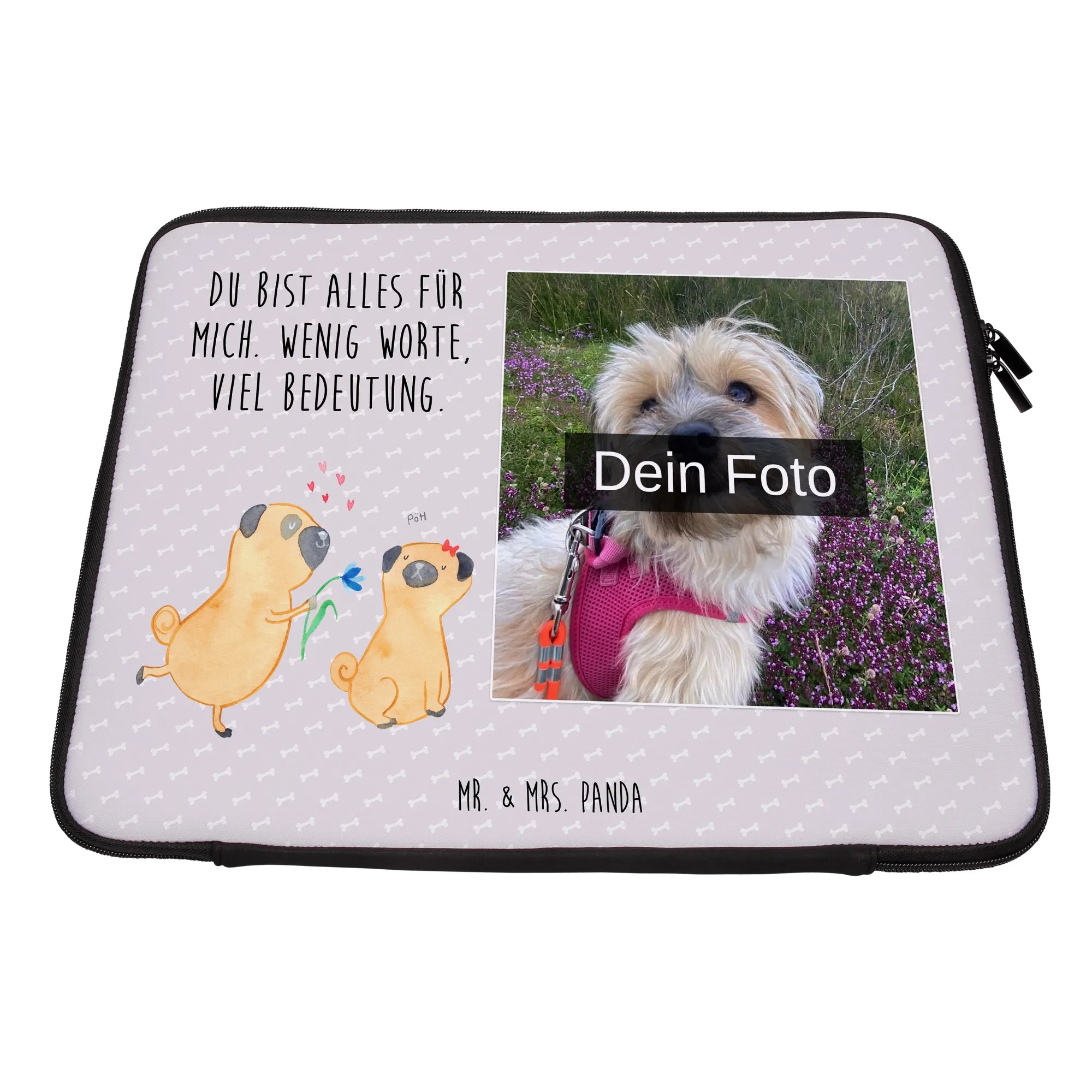 Die personalisierte Foto Notebook Tasche von Mr. & Mrs. Panda ist der optimale Schutz für deine elektronischen Geräte! Diese stilvolle und praktische Tasche misst 360 mm x 270 mm x 30 mm und besteht aus wasserabweisendem Neopren. Ihr leichtes Design macht sie perfekt für unterwegs! Die Vorder- und Rückseite sind aufwendig mit entzückenden Motiven und Sprüchen bedruckt. Du kannst die Tasche ganz individuell mit deinem eigenen Foto gestalten. Denke daran, ein Bild in hoher Auflösung hochzuladen, damit das Druckergebnis gestochen scharf ist. Der robuste Reißverschluss sorgt dafür, dass dein Gerät sicher verstaut ist und schnell zugänglich bleibt, während die Tasche gleichzeitig Schutz vor Kratzern, Staub und weiteren Beschädigungen bietet. Pflege sie ganz einfach mit einem feuchten Tuch — sie sollte nicht in die Waschmaschine! Perfekt für das geschäftige Leben oder als durchdachtes Geschenk für Freunde und Familie! Verleihe deinem Laptop eine persönliche Note mit unserer einzigartigen Tasche, die dich immer begleitet.